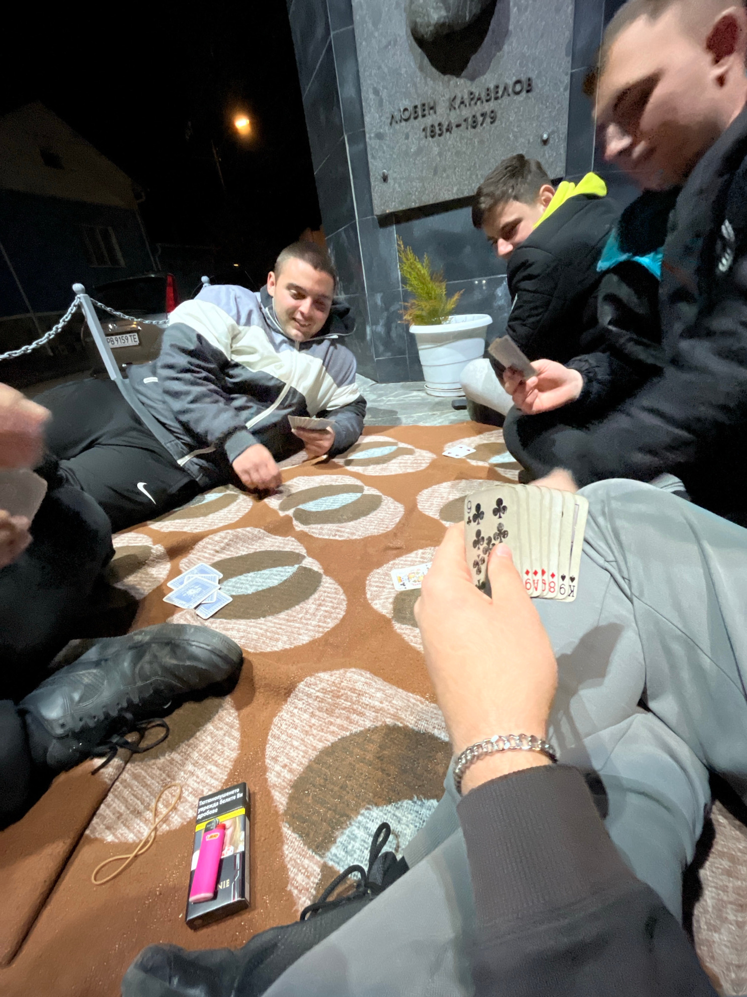The image shows a group of people playing cards outdoors at night, seemingly near a monument or grave marker with Cyrillic inscriptions ("ЛЮБЕН КАРАВЕЛОВ 1834-1879"). This indicates a potential locati…read more