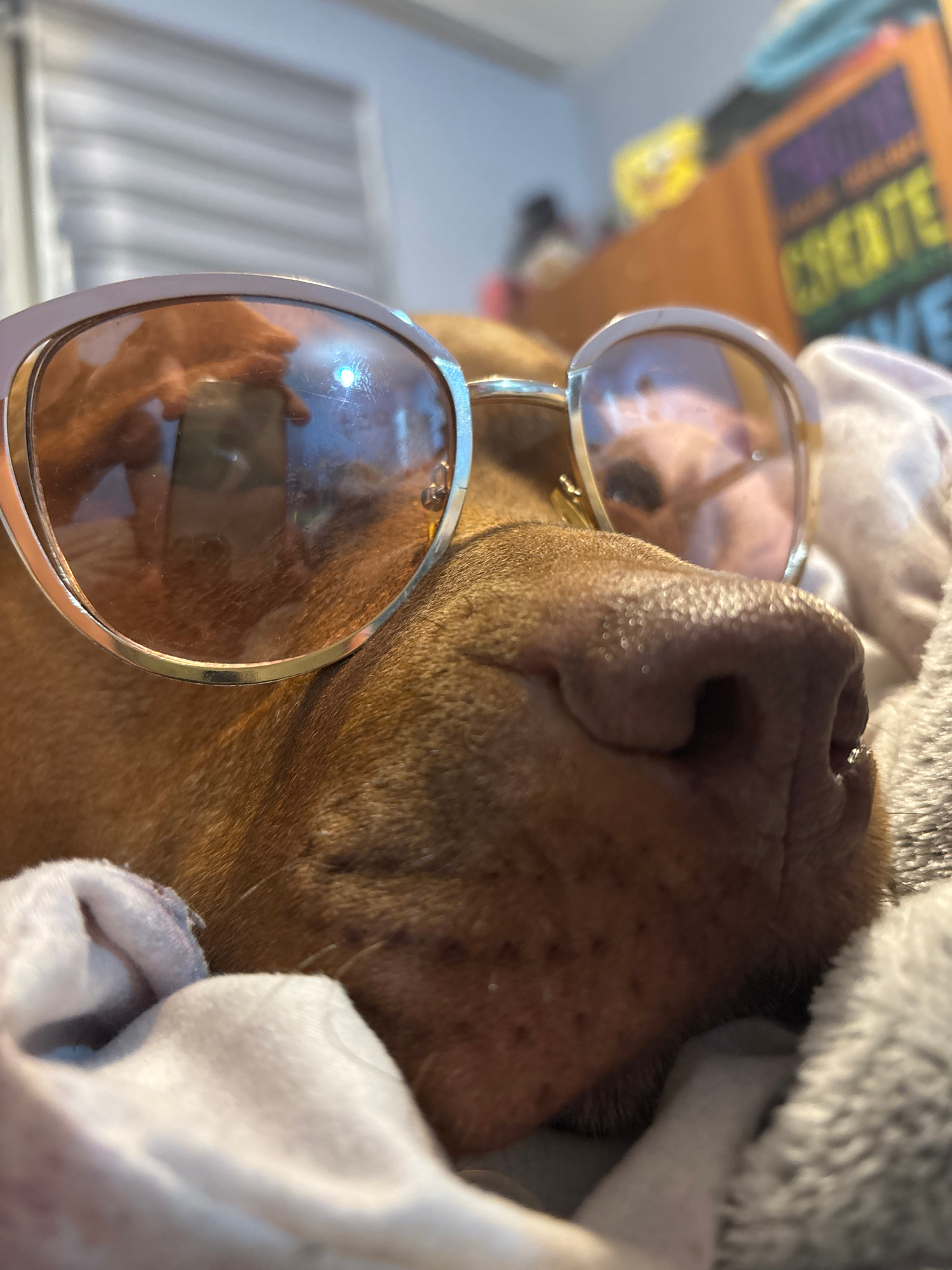 A charming close-up shot captures a brown-coated dog, likely a pit bull or similar breed, resting comfortably indoors. The dog's prominent snout and wet nose are central in the foreground, with its sh…read more