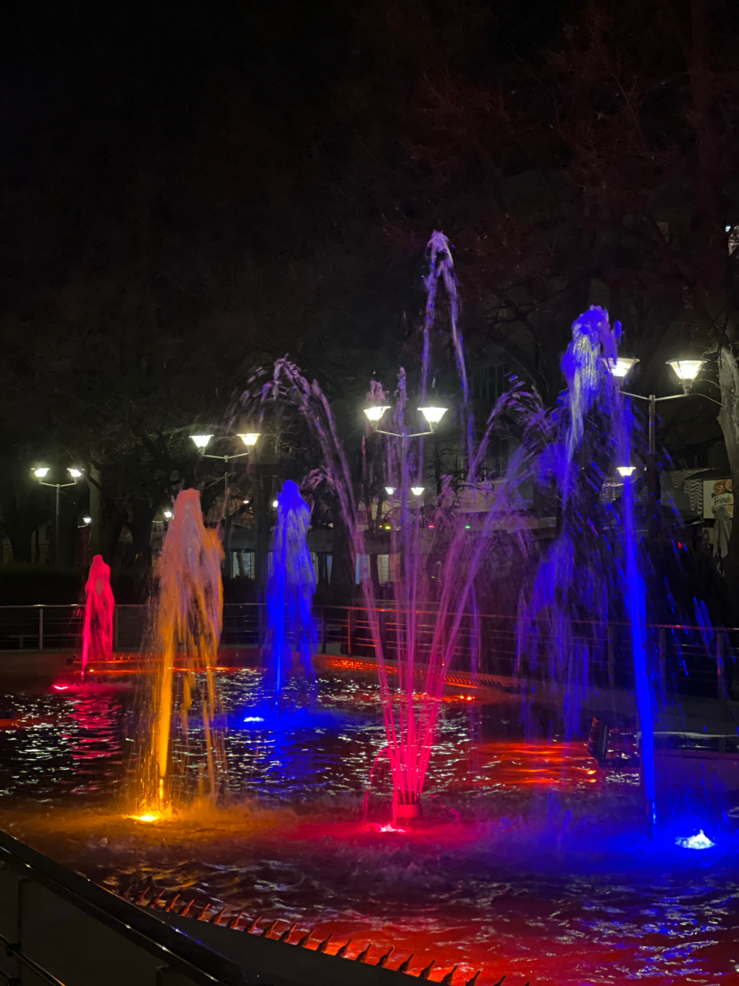 The image shows a colorful fountain at night in Pernik, Bulgaria. The fountain has multiple streams of water lit up in blue, red, and orange. The background includes trees and streetlights. There is a…read more