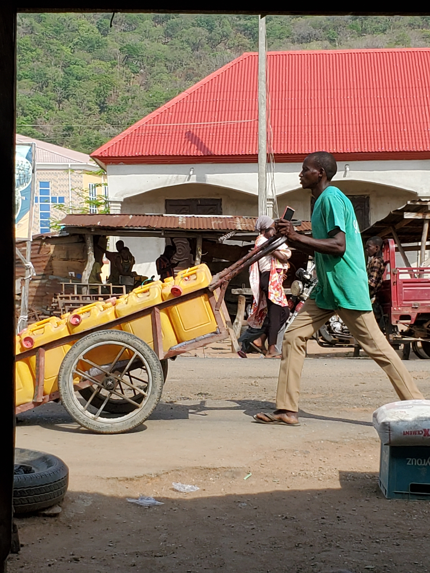 This image, taken in Mararaba, Nigeria, captures a bustling street scene under bright daylight. The photograph is oriented 90 degrees clockwise. In the foreground, a man wearing a green t-shirt and t…read more