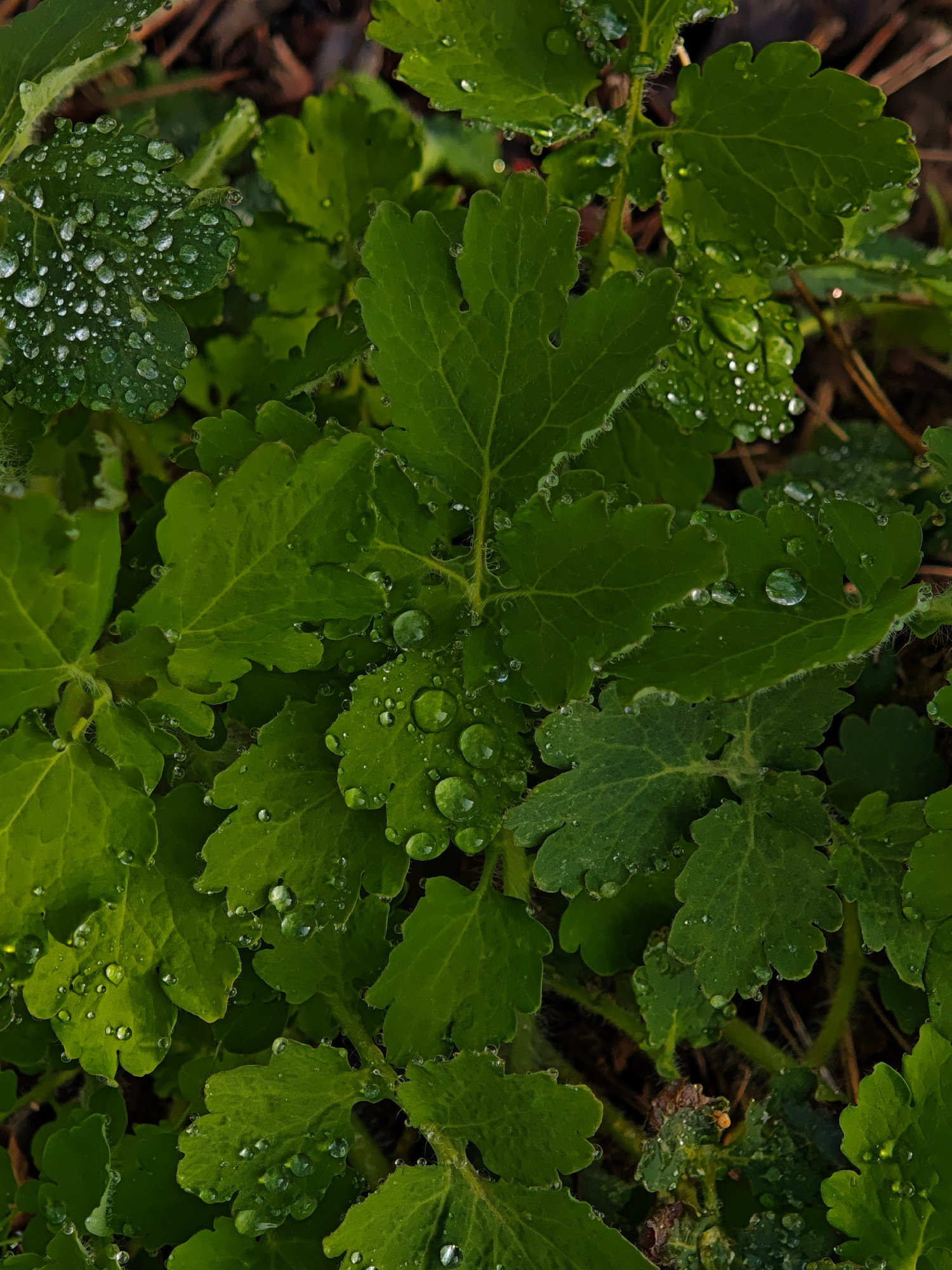 The image shows a close-up view of green plants, specifically Chelidonium majus (greater celandine), covered with numerous water droplets. The leaves are deeply lobed and have a slightly irregular, sc…read more