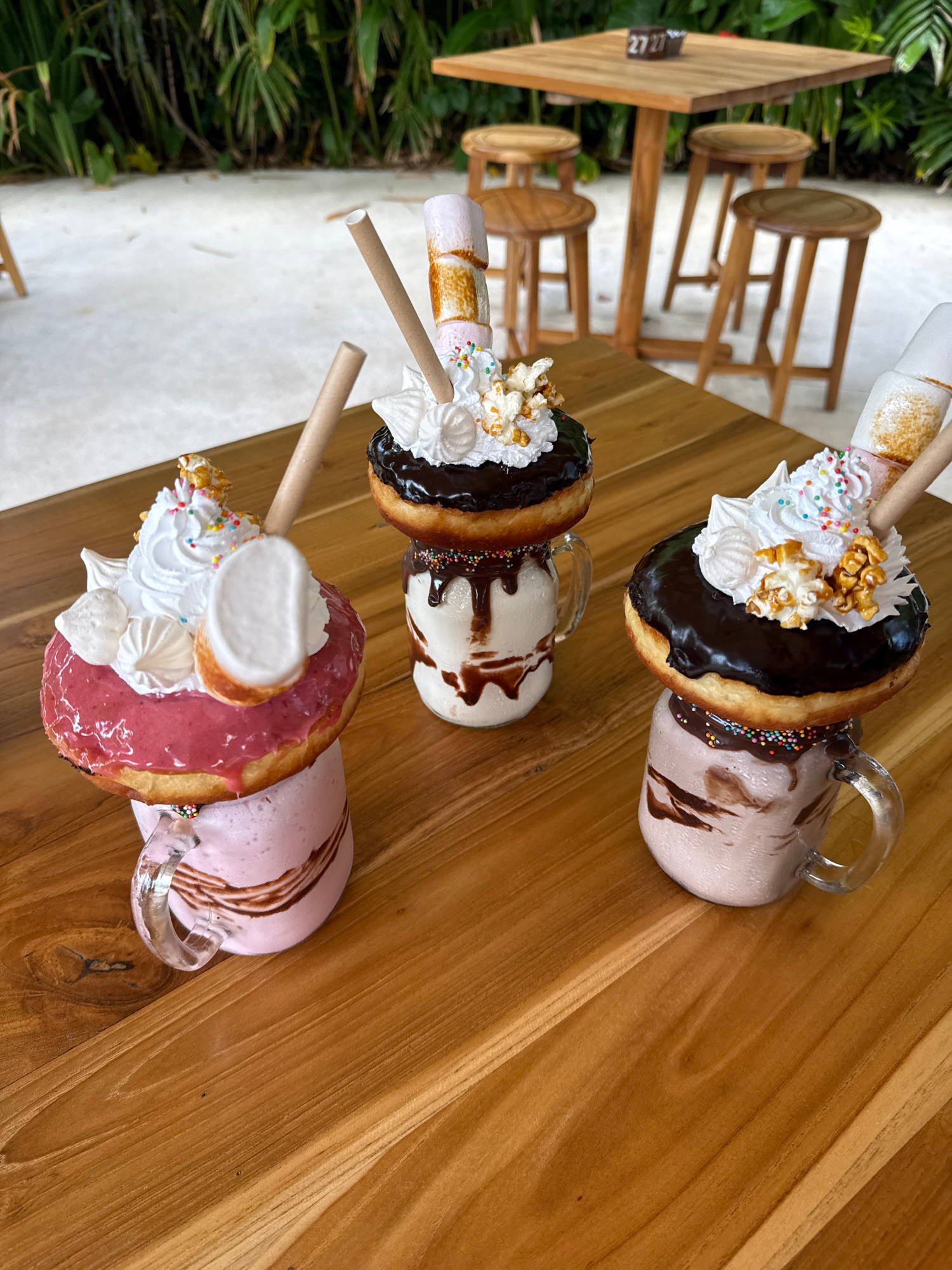 The image shows three elaborately decorated milkshakes on a wooden table. Each milkshake is served in a glass mug with a handle and is topped with a doughnut, whipped cream, popcorn, sprinkles, and a toasted marshmallow on a stick. The doughnuts are glazed in different colors: chocolate, vanilla, and strawberry. The milkshakes themselves are also different colors, corresponding to the doughnut glaze colors. In the background, there are several wooden stools, and some green foliage is visible. The image appears to have been taken at a cafe or restaurant, likely in Kuta, Indonesia, given the tropical vegetation and the style of the food presentation. | Open Wire