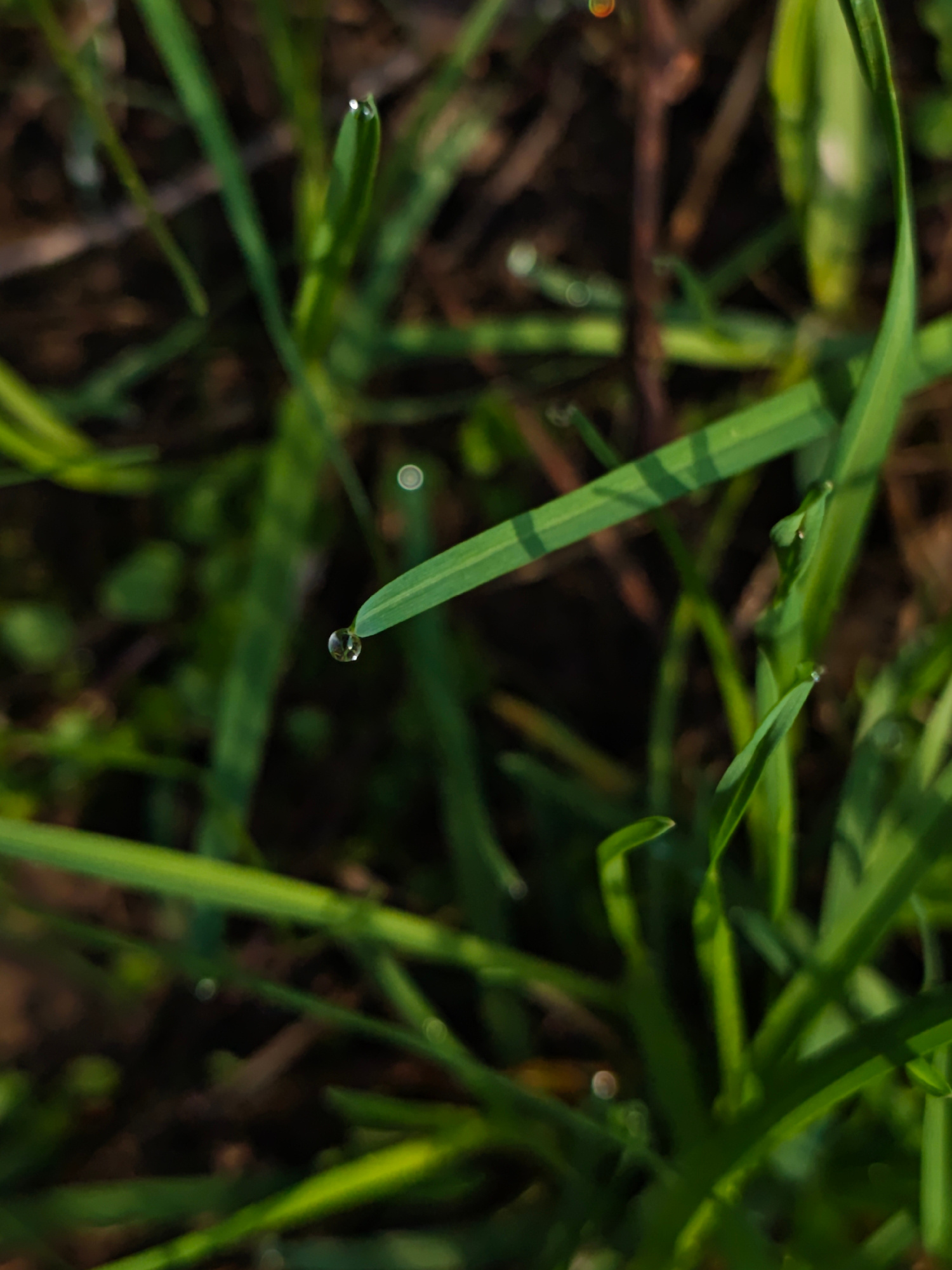The image depicts a close-up view of grass, likely in Parkhomivka, Ukraine. A single blade of grass prominently features a water droplet clinging to its tip. Additional blades of grass, along with som…read more
