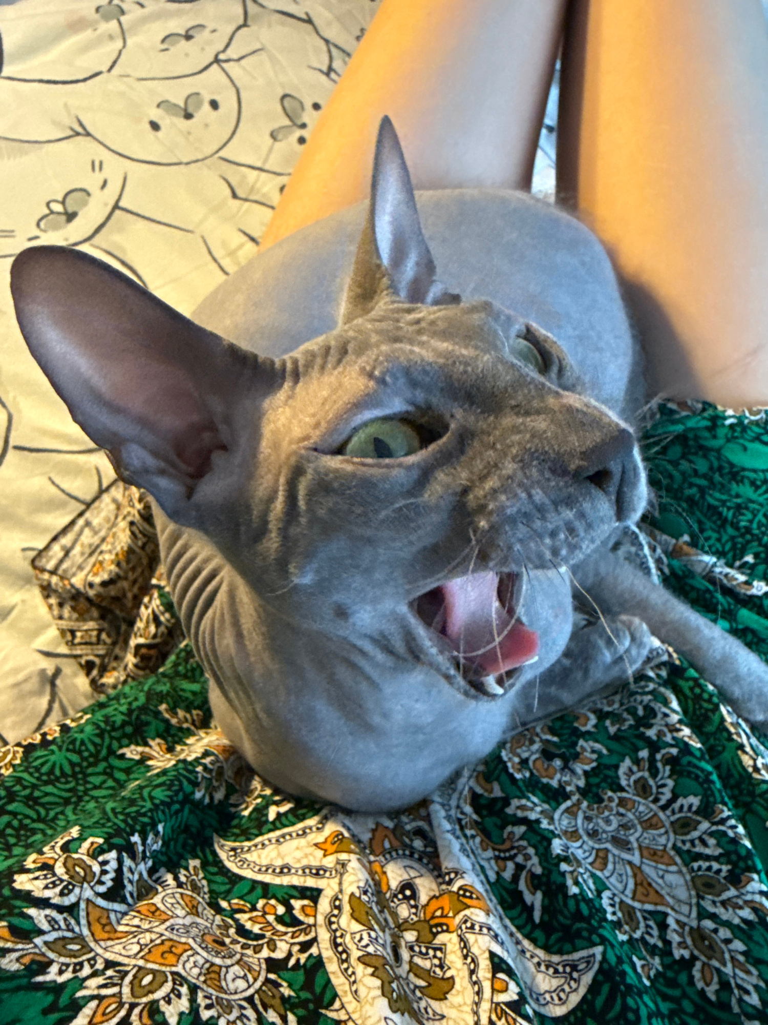 A hairless grey cat with green eyes and an open mouth, tongue protruding, lies on a person's lap. The person is wearing a patterned green, white, and brown garment. The cat's fur appears wrinkled. The…read more