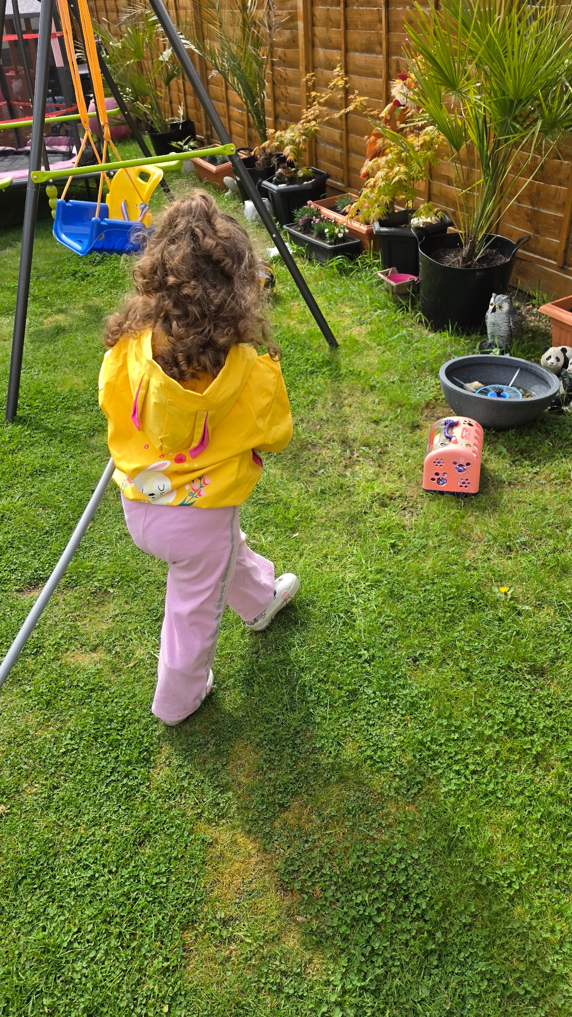 A child with long brown curly hair, wearing a yellow hooded jacket and pink pants, is standing on a green lawn next to a swing set. The location appears to be a garden, with a wooden fence and various…read more