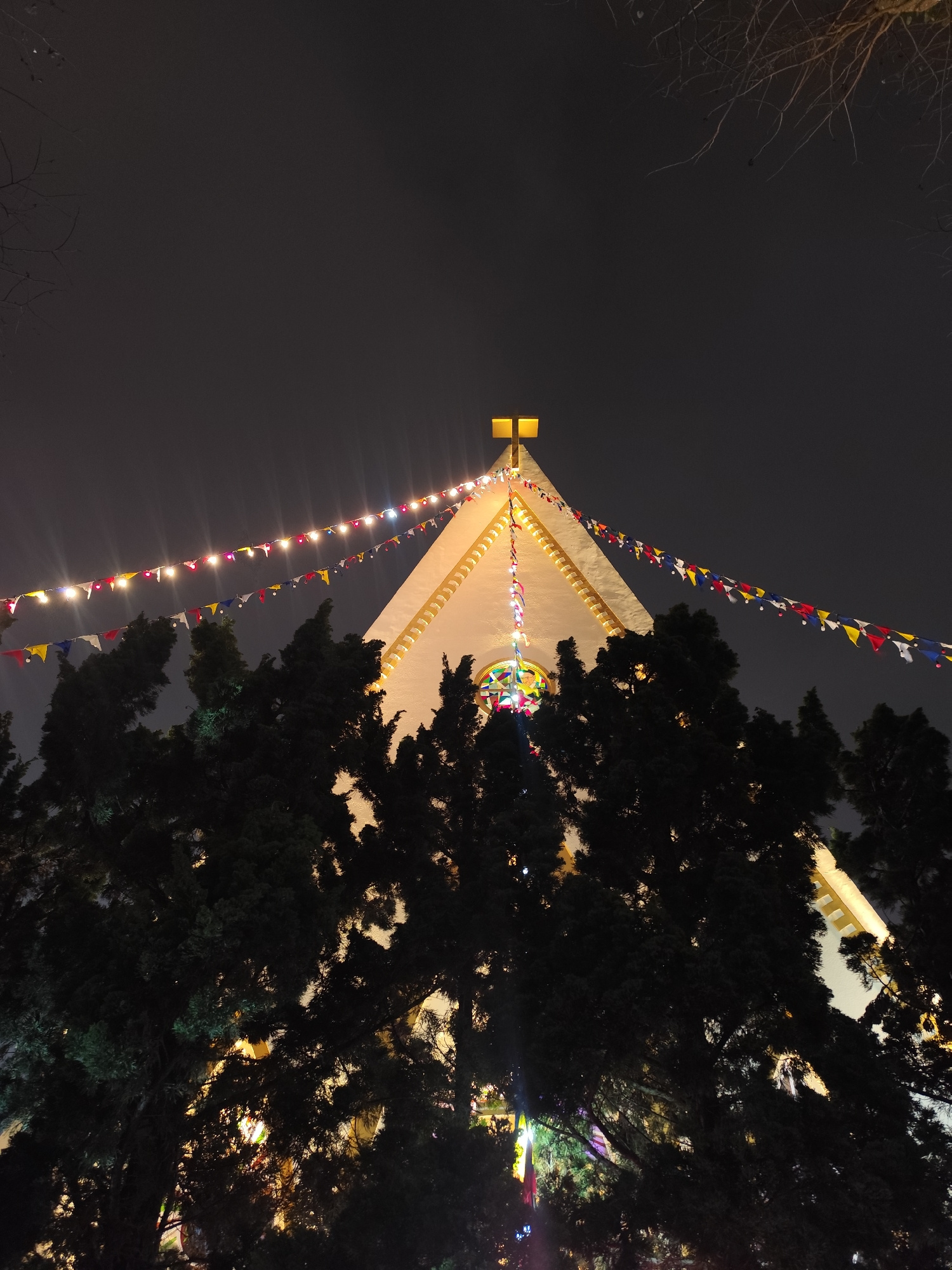 A low-angle shot shows the facade of a white building with a steeple topped by a lit cross, likely a church, at night. The building is adorned with strings of colorful pennant flags and lights. A larg…read more