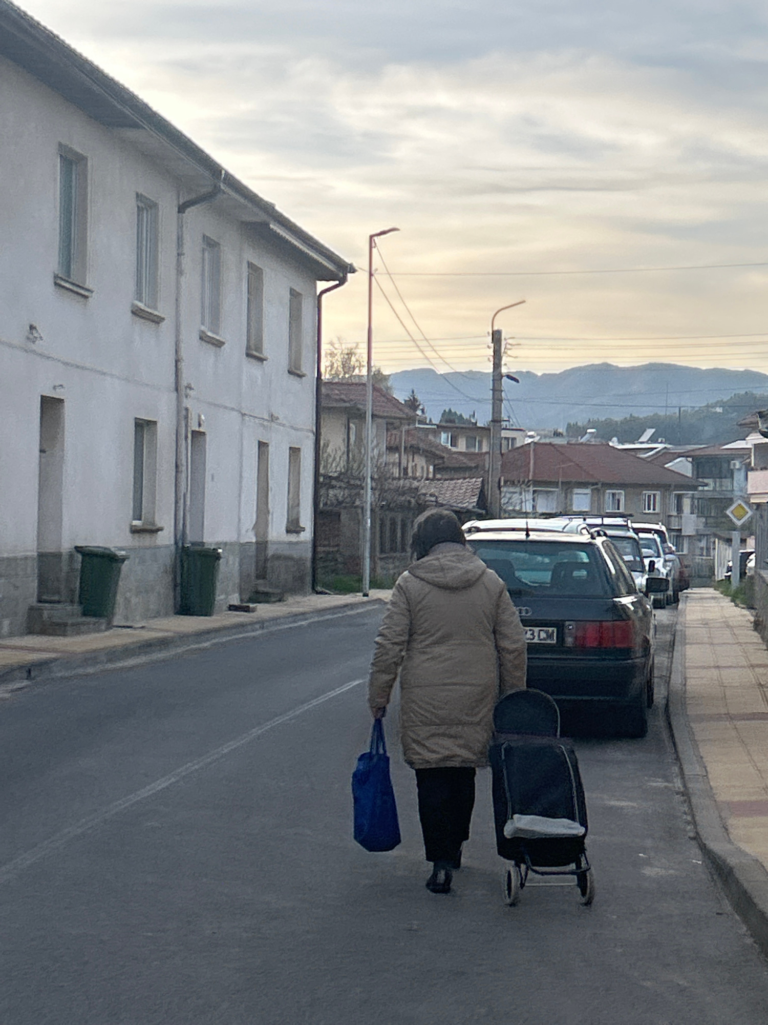 A person is walking down a street in what appears to be Zlatograd, Bulgaria, pulling a black roller suitcase. The individual is wearing a light brown jacket and black pants, and carrying a blue bag in…read more