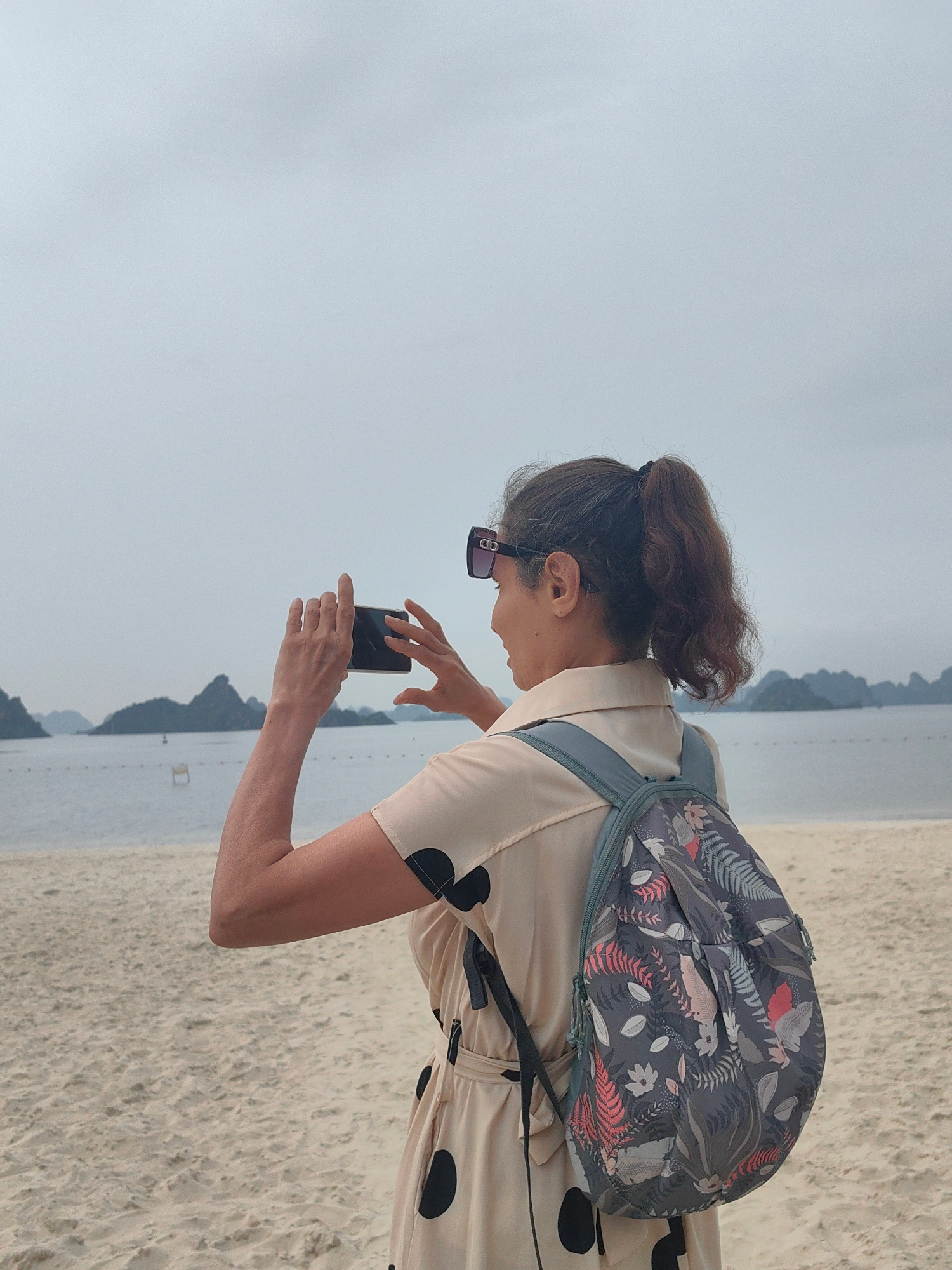A woman stands on a sandy beach holding a smartphone to take a picture of the scenic view of Ha Long Bay, Vietnam. She is facing away from the camera with her back to the viewer. She has brown hair in…read more