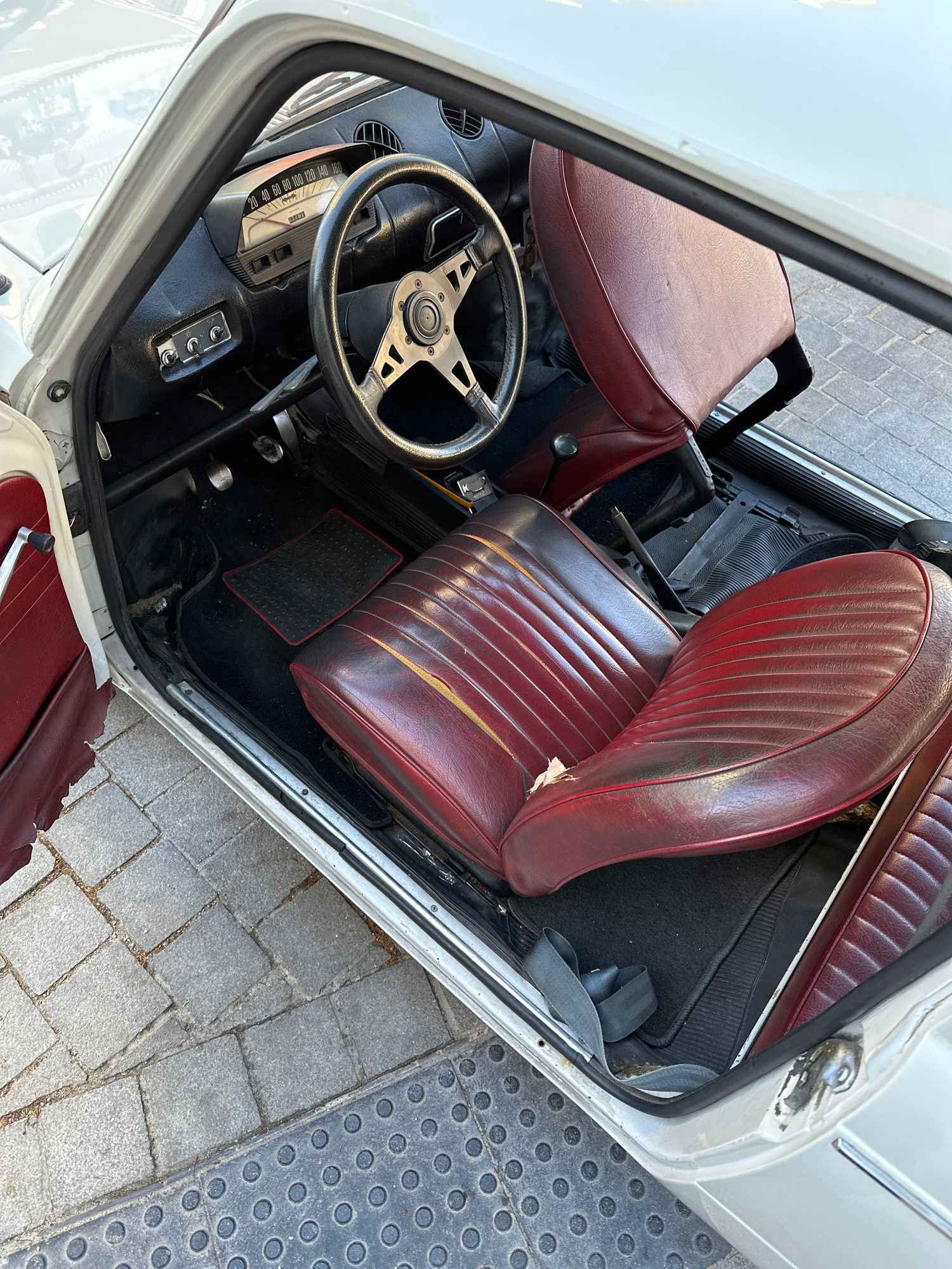 The image depicts the interior of a vintage car, specifically the driver's side. The seats are upholstered in a worn, burgundy-colored material with a ribbed pattern. The steering wheel has a four-spo…read more