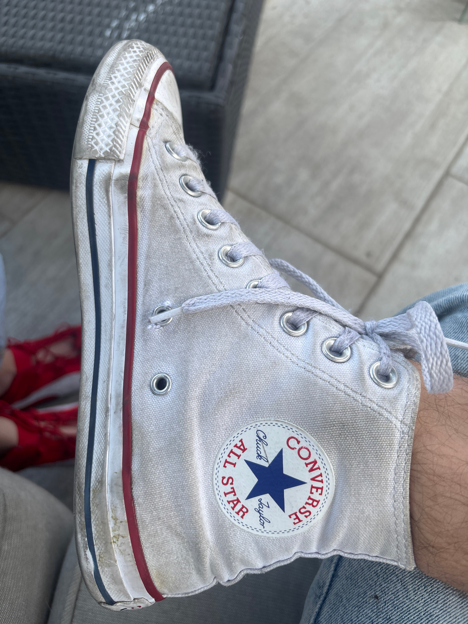 A close-up shot depicts a worn, white Converse Chuck Taylor All Star high-top sneaker. The shoe is laced up, but the laces are untied and hanging loosely. The iconic circular Converse logo with a blue…read more