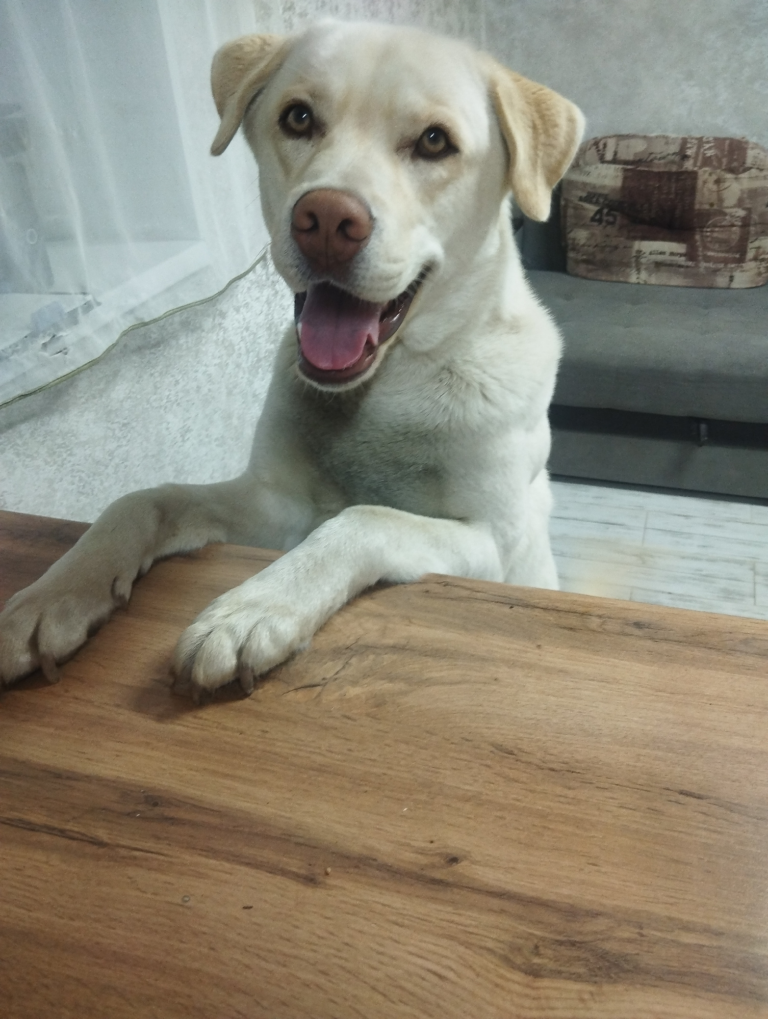 A light-yellow Labrador Retriever dog stands with its paws on a wooden table. The dog has brown eyes, a pink nose, and an open mouth. The table has a smooth, light-brown wood grain. A semi-transparent…read more