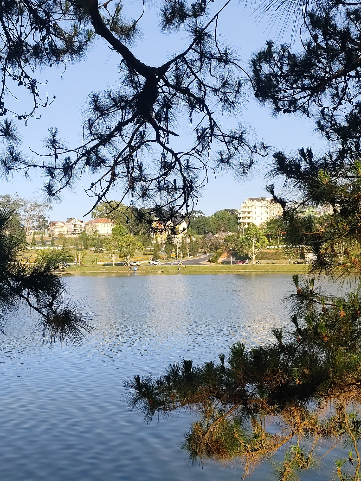 The image shows a view of Xuan Huong Lake in Da Lat, Vietnam, framed by pine tree branches. The lake's surface reflects the sky and the surrounding trees. On the opposite shore, a road with cars and p…read more