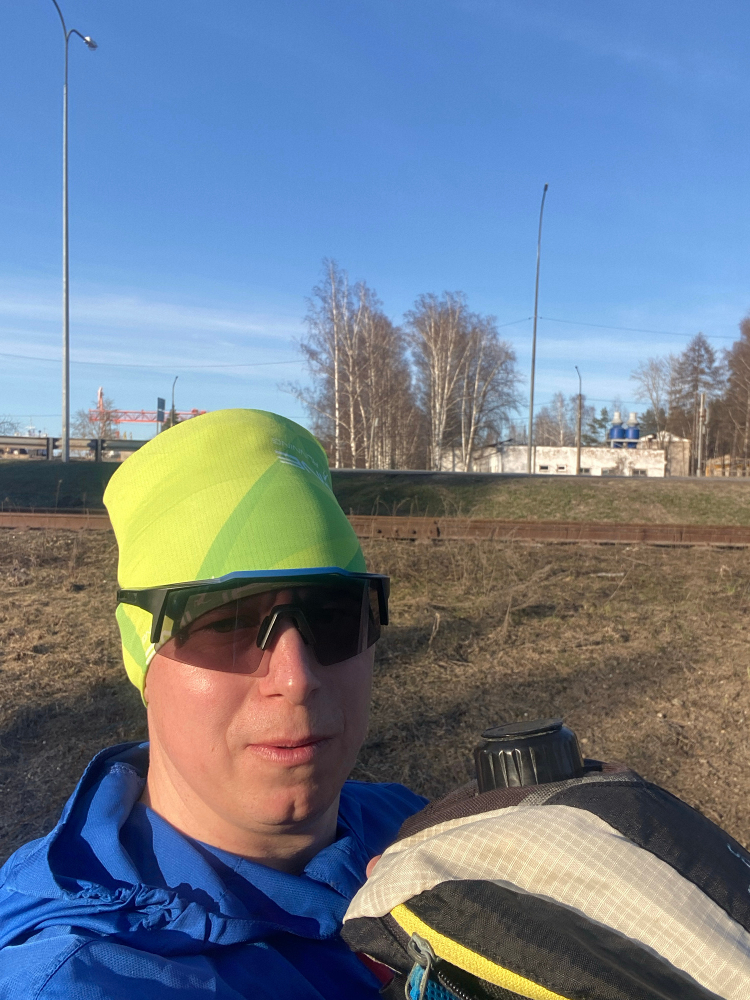 A person wearing a blue hooded jacket, a yellow and green cap, and dark sunglasses is taking a selfie outdoors. The background shows a clear blue sky, bare trees, streetlights, and a building in the d…read more