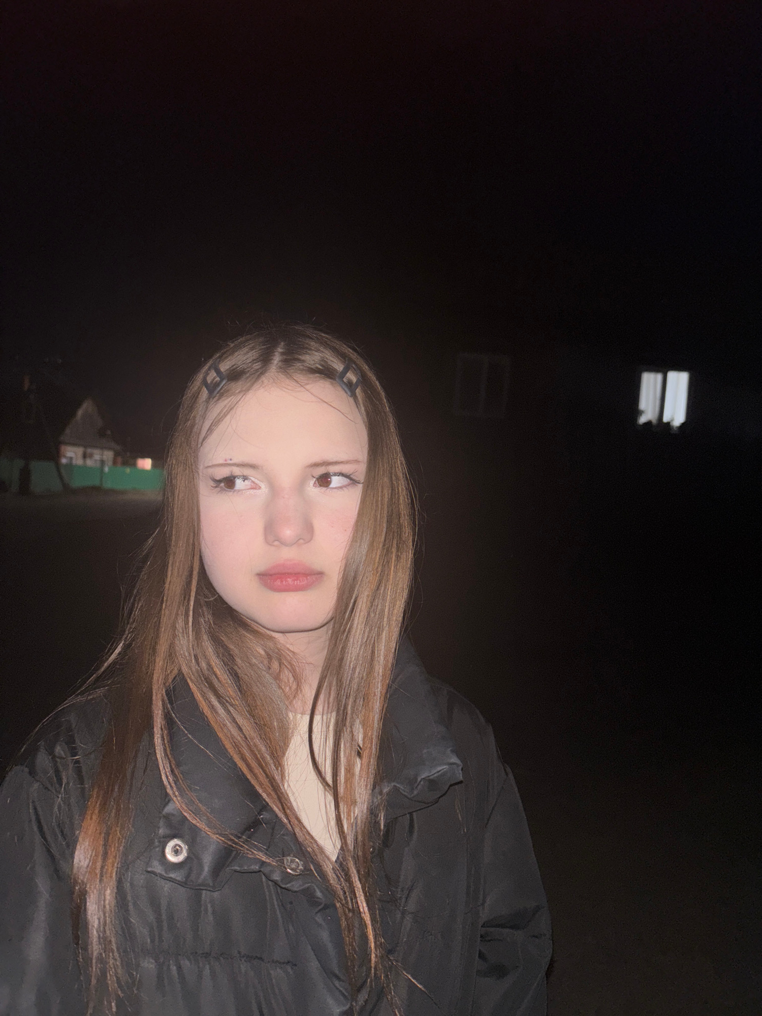 A close-up, rotated portrait features a young girl, likely taken at night. She has long, straight, medium-brown hair parted down the middle, with multiple dark hair clips adorning the sides. Her face…read more