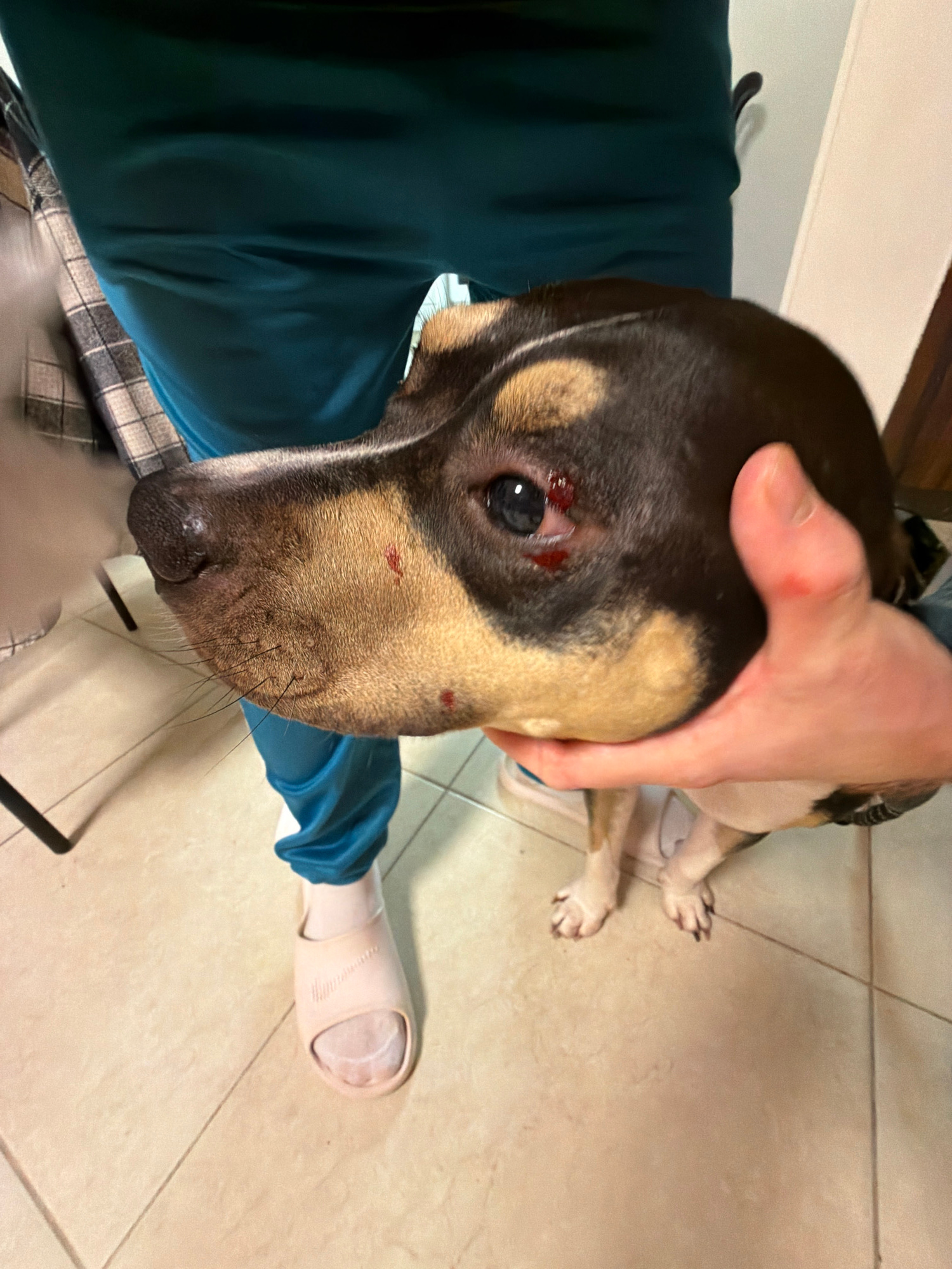 An indoor scene in the city of Tel-Aviv, Israel, depicts a multi-colored dog with black, tan, and white fur, primarily viewed from its head and front paws. A person, identified by their lower torso we…read more