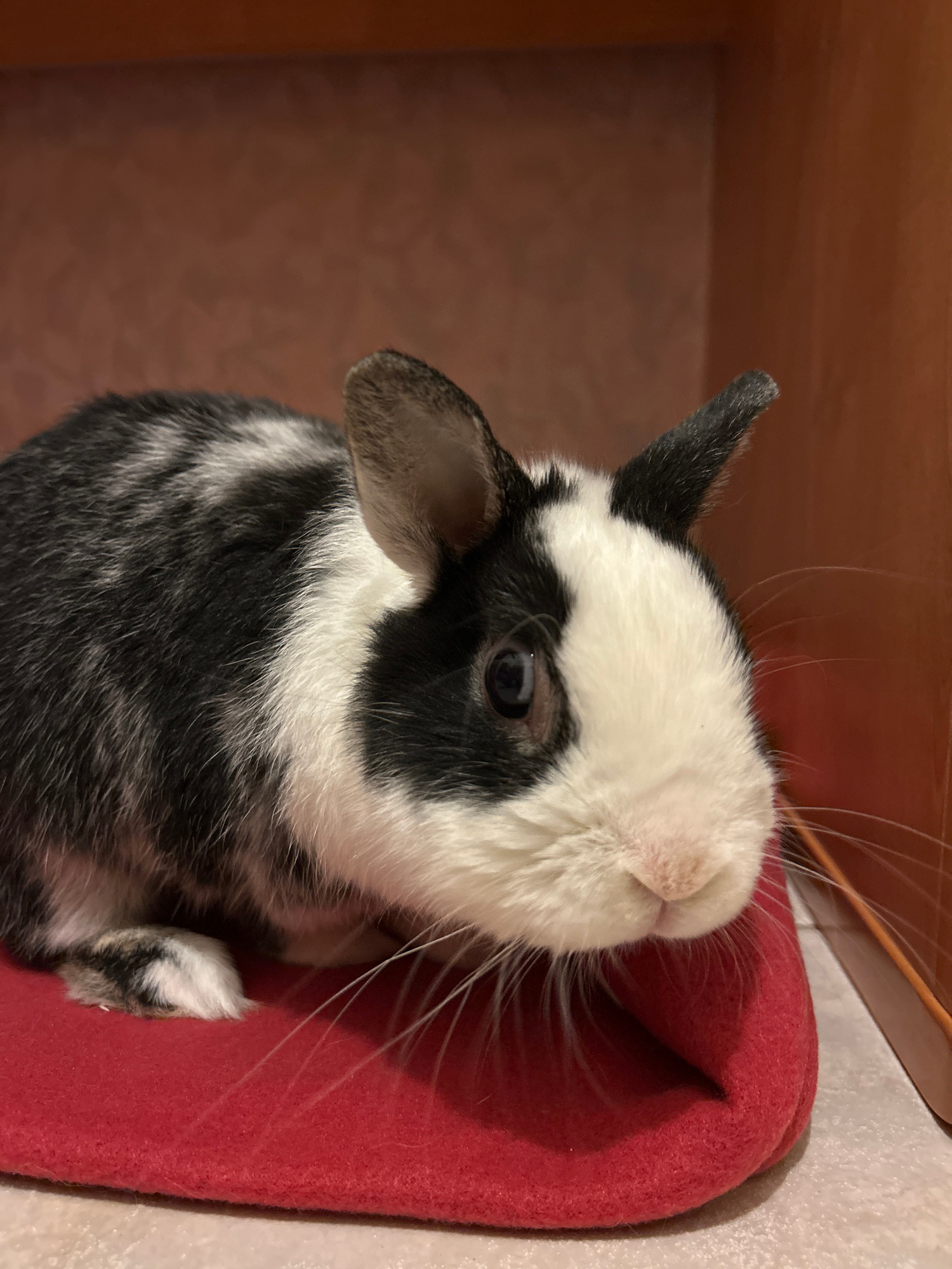 A close-up photograph depicts a black and white rabbit nestled in a red, soft-looking material. The rabbit has one ear perked up and the other folded over. The location in the city of Truchtersheim, F…read more