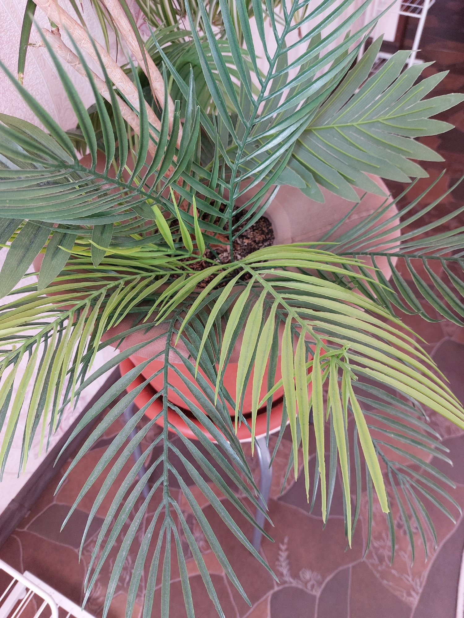 A high-angle, medium shot depicts a potted plant with a mix of palm-like and broader, leaf-like fronds. The plant is contained within a terracotta-colored pot. The location is not provided.
