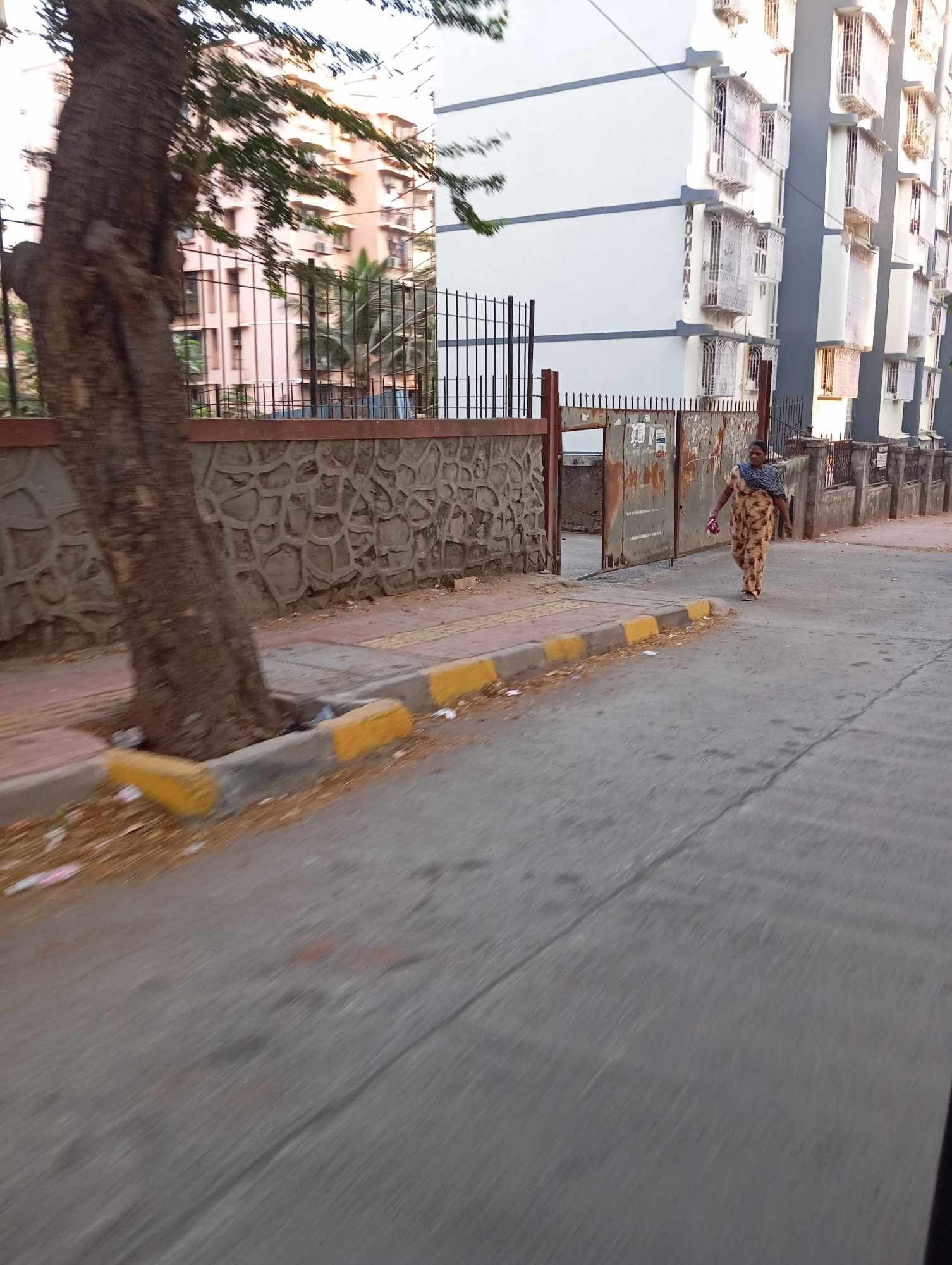 An eye-level, long outdoor shot shows a woman walking in the city of Mumbai, India. On the left side of the scene is a tree on a small median, with a cracked yellow curb separating the median from th…read more