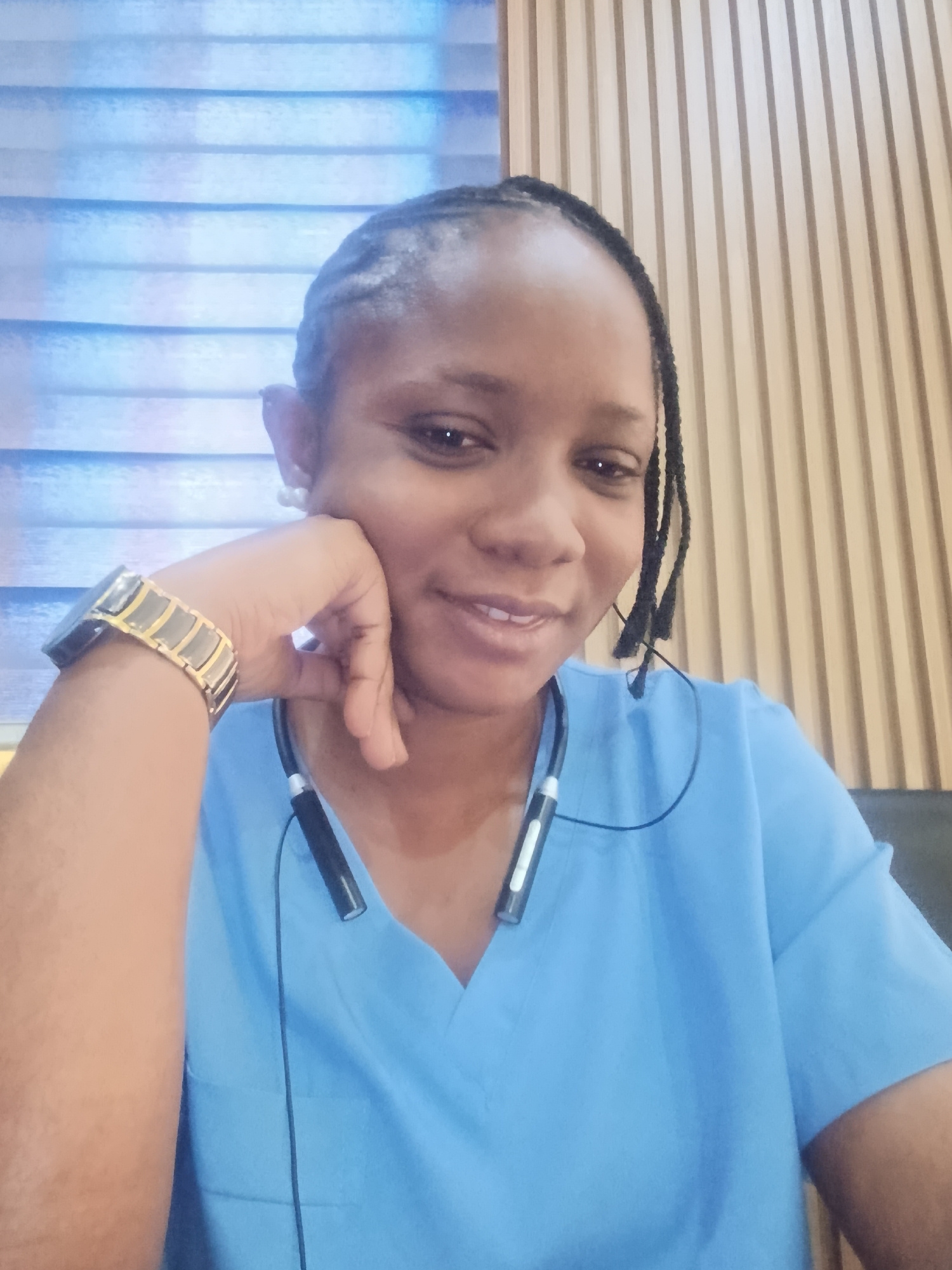A woman with braided hair is wearing a light blue scrub top and black headphones around her neck. She is resting her chin on her hand, on which she is wearing a gold and silver watch. She is smiling s…read more