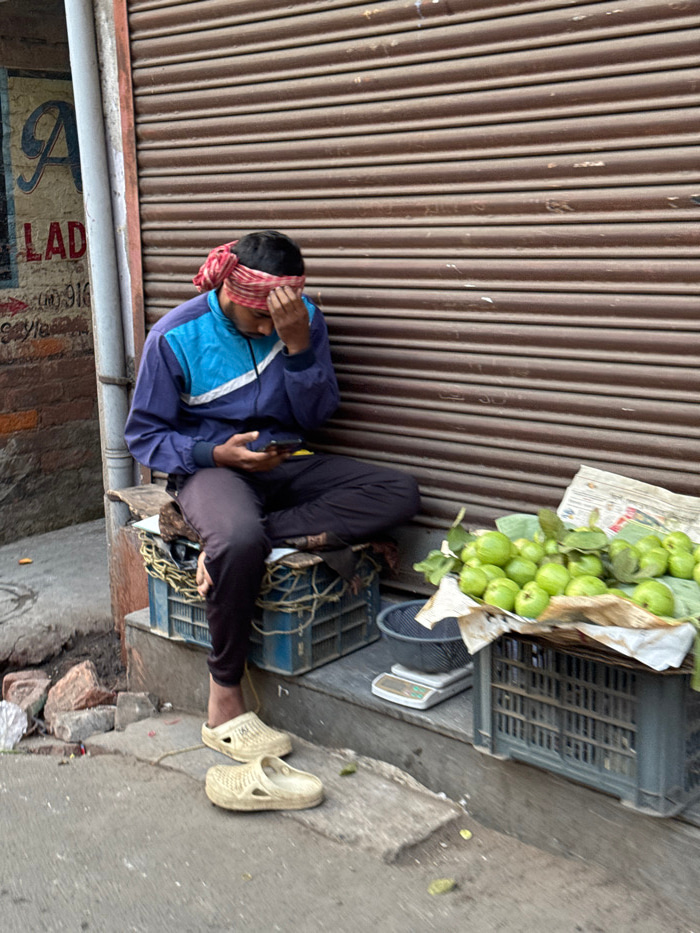 A seated person leans against a closed, brown corrugated metal wall, eyes covered by a red-and-white cloth. The person wears a blue tracksuit with a white stripe and dark pants. A crate of green guava…read more