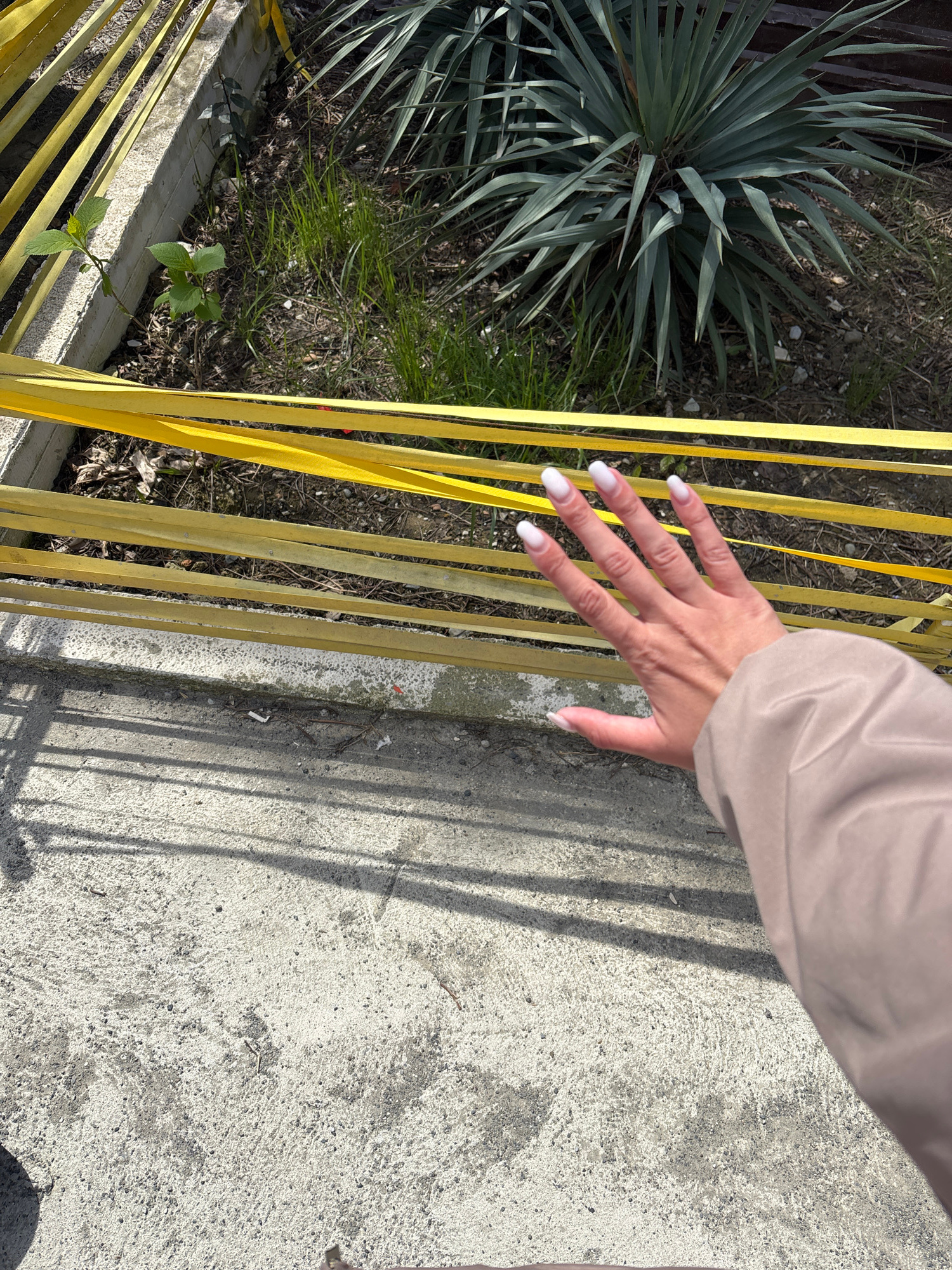 The image shows a hand with white-tipped nails reaching towards yellow strips arranged vertically. To the left, there's a spiky green plant and some other greenery in a garden area. The right side of…read more