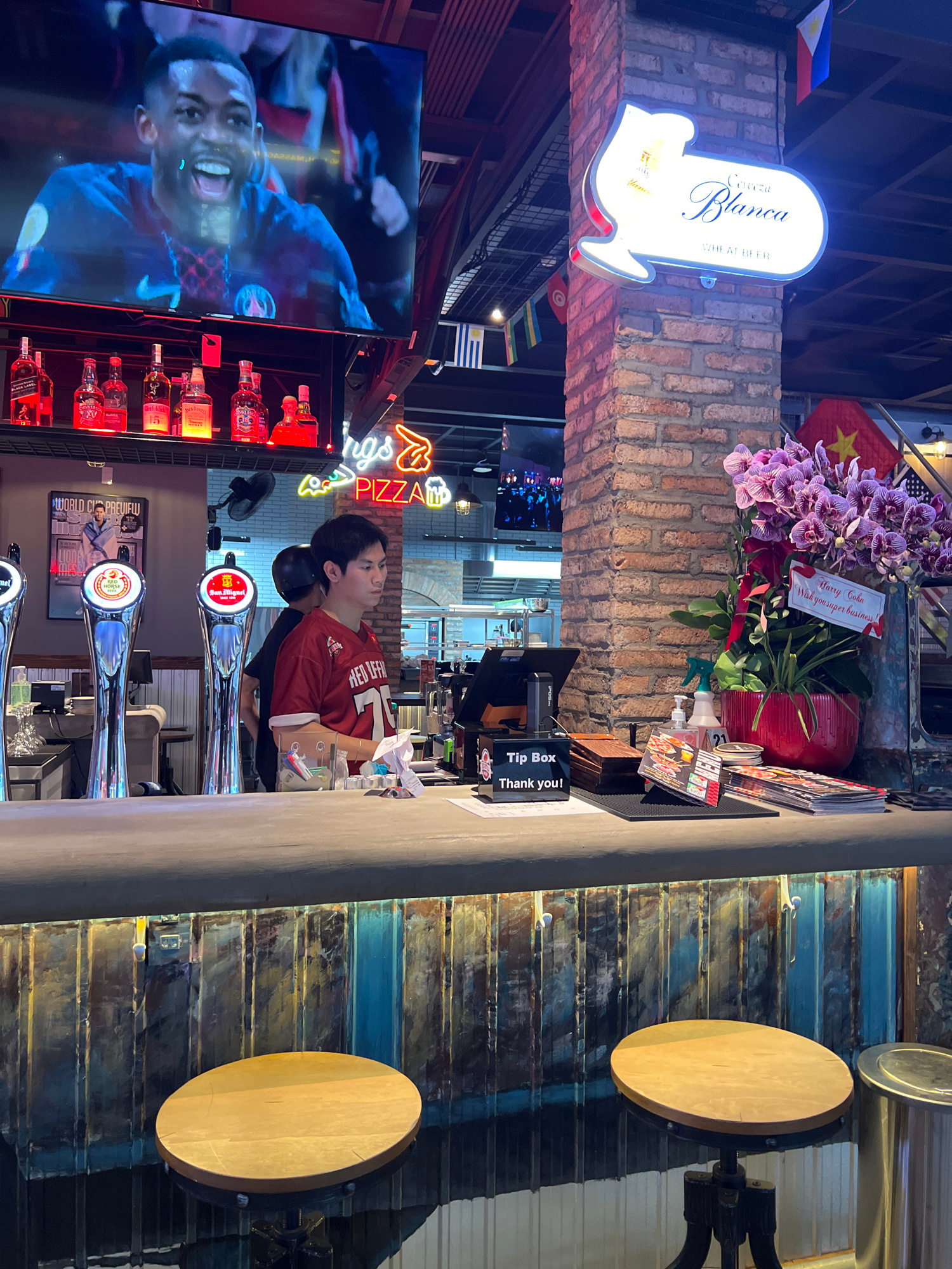 The image shows the interior of a bar, likely in Bắc Nha Trang, Vietnam, based on the Vietnamese flag present. A person wearing a red soccer jersey is visible behind the bar counter. On the back wall…read more