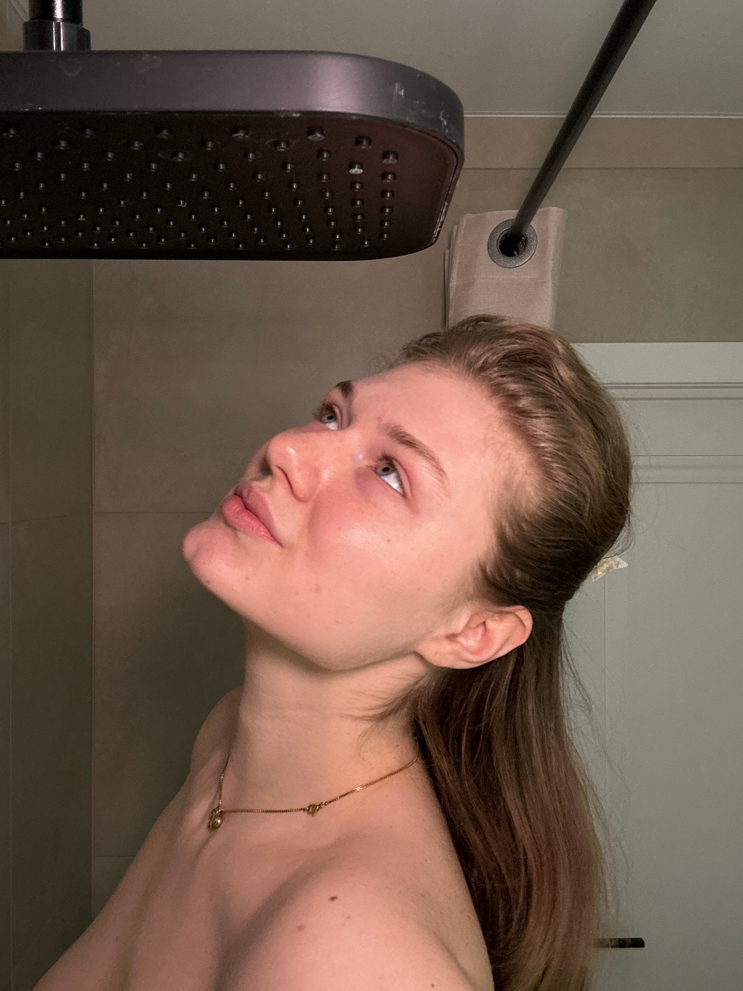 A woman is shown in a close-up shot in what appears to be a bathroom. The woman has light skin, brown hair partially pulled back with a clip, and is wearing a delicate gold necklace. She is looking in…read more