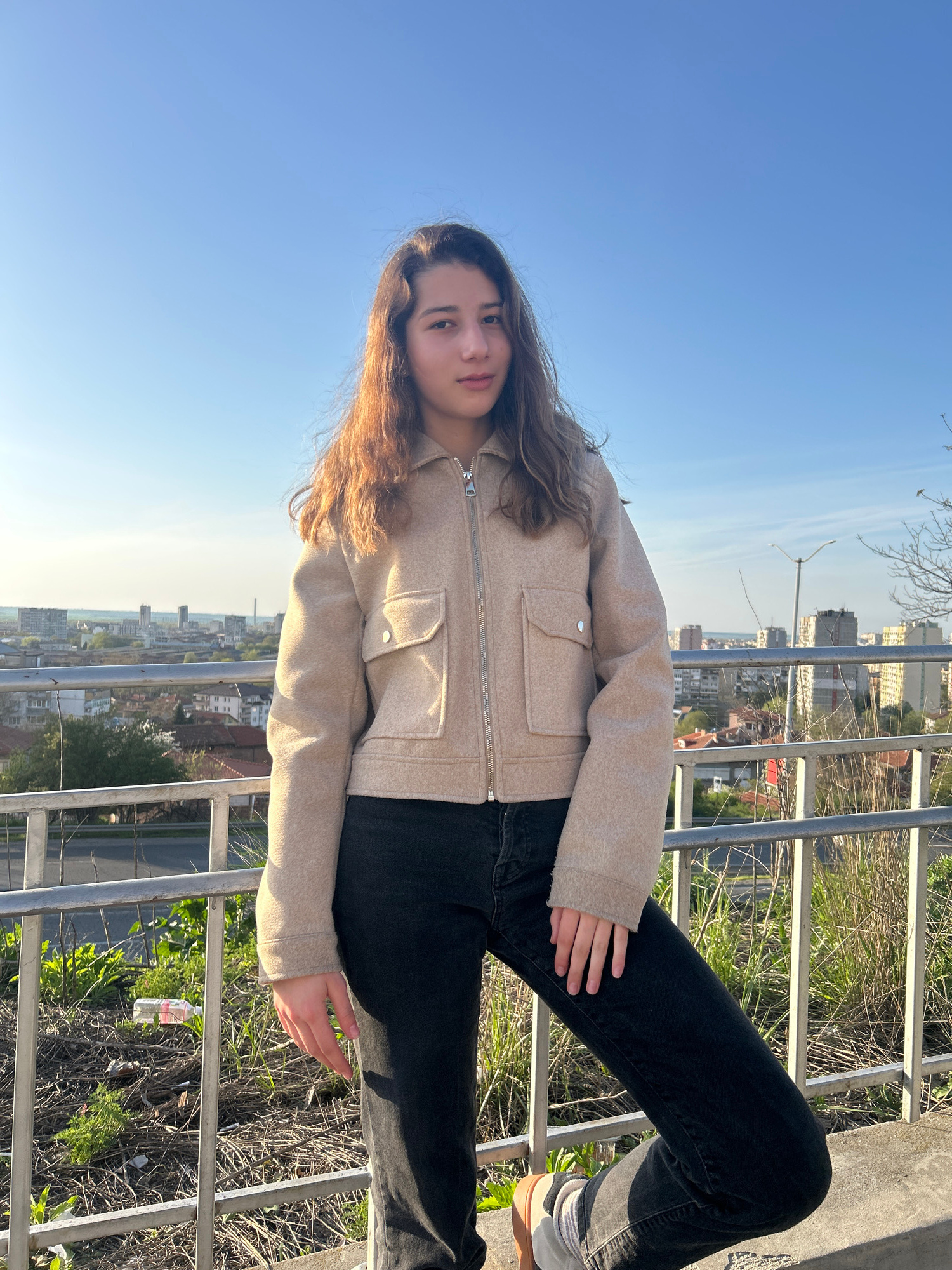 The image, rotated 90 degrees clockwise, features a young woman seated or leaning against a metal railing in Ruse, Bulgaria. She has long, wavy, medium-brown hair, fair skin, and looks directly at the…read more