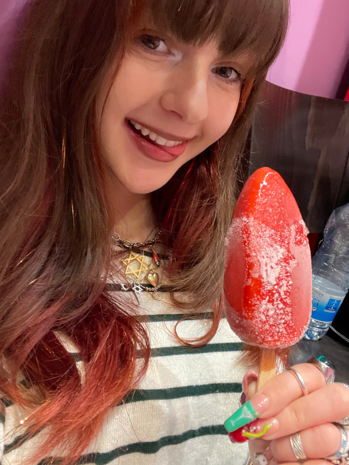A smiling woman with brown hair and bangs, some red streaks, and tinsel strands, holds a frozen red ice pop with a wooden stick. The woman has brown eyes and shows her teeth with her tongue slightly v…read more