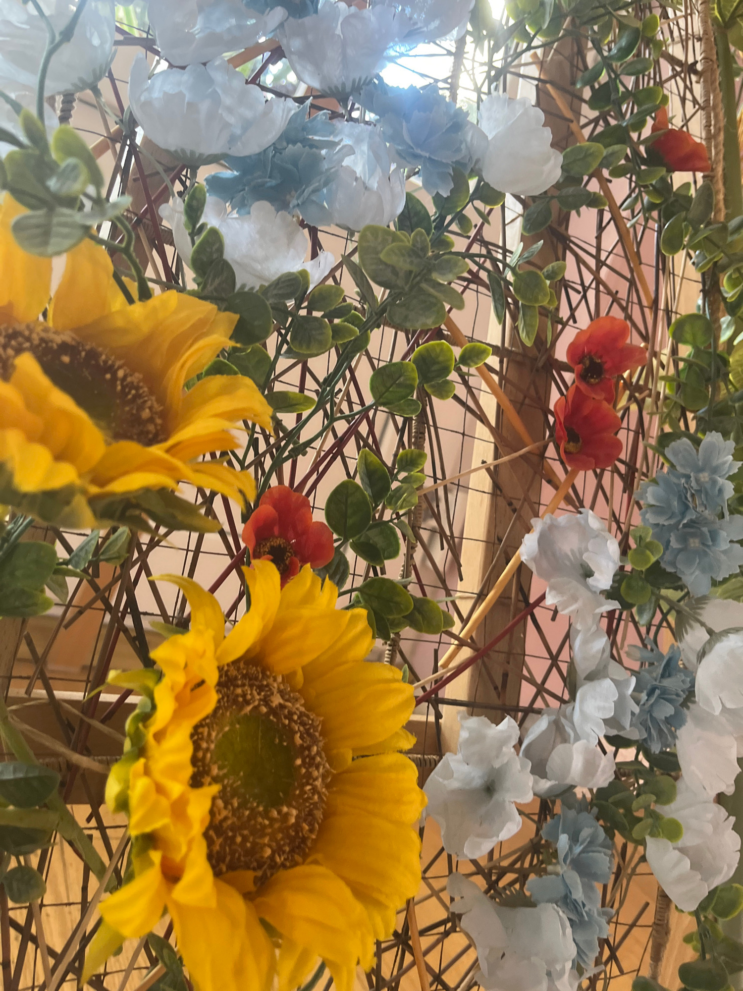The image depicts a floral arrangement against a backdrop of woven wooden or bamboo slats. Two sunflowers, one partially obscured, dominate the lower portion of the frame. Above, there are intersperse…read more