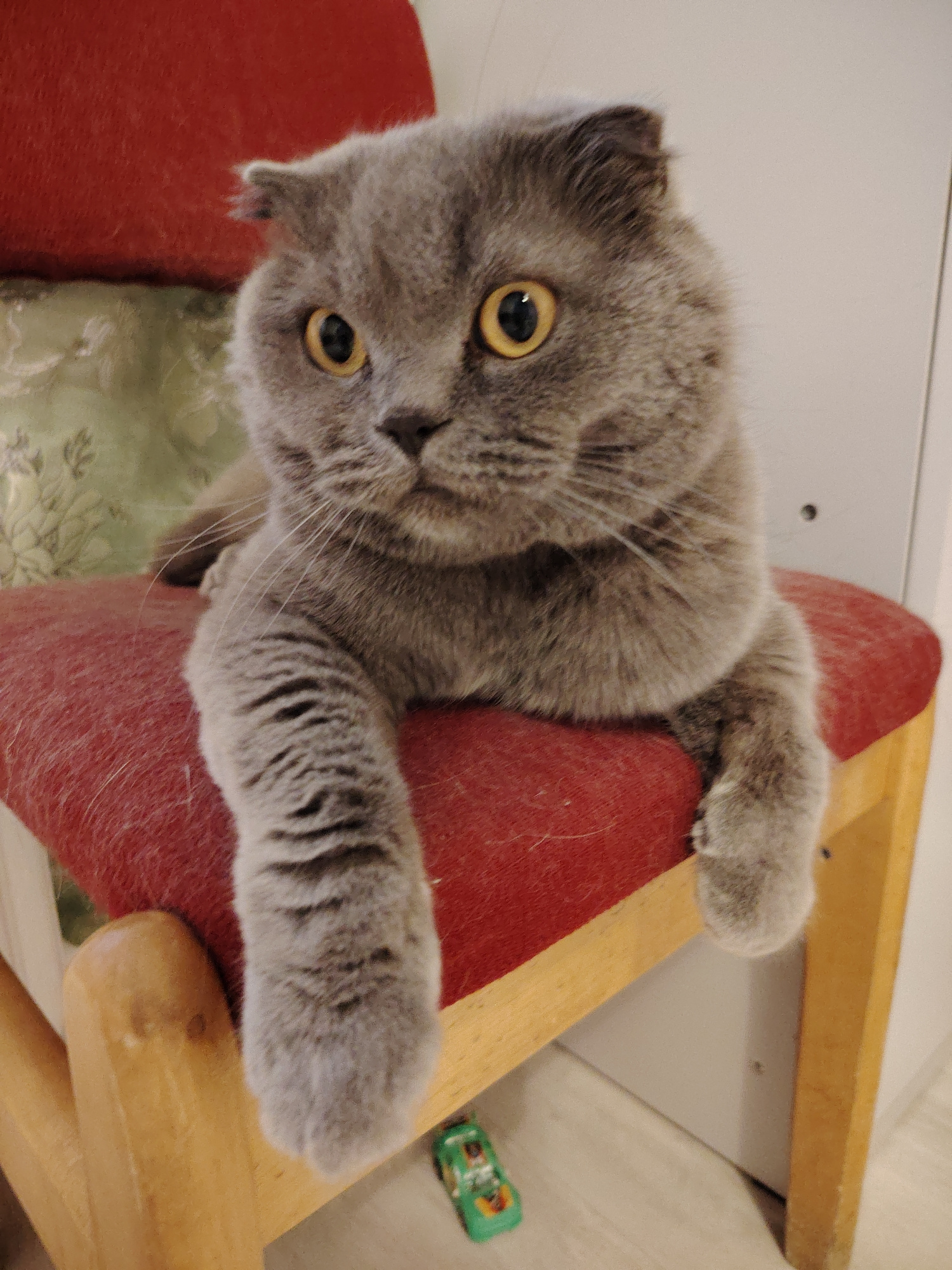 A gray Scottish Fold cat sits on a red chair. A green toy car rests on the floor below the chair. The location is Марковский, Russia.
