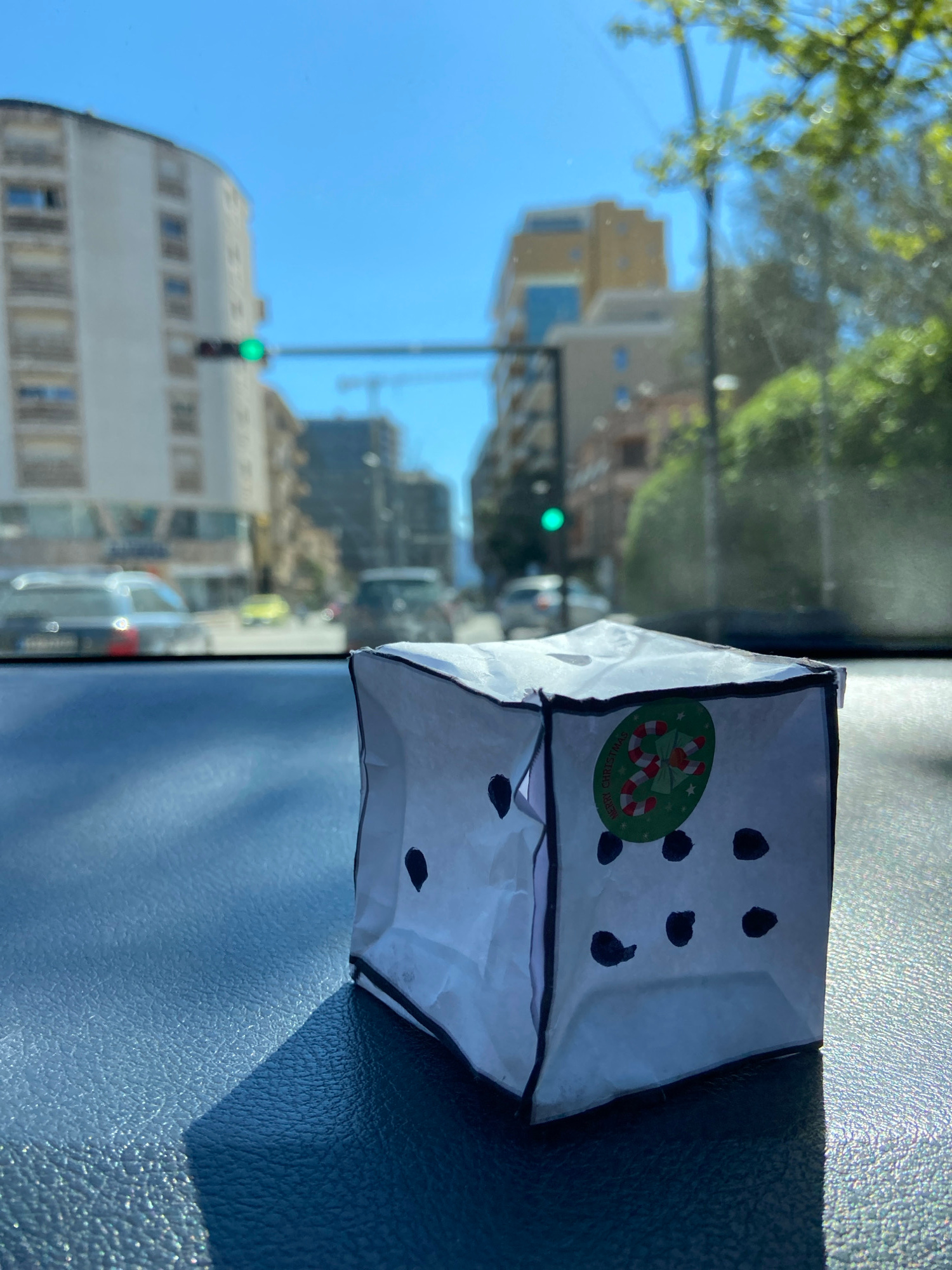 The image shows a small, white paper bag designed to resemble a die sitting on a dark gray textured surface, likely a car dashboard, with a green "Merry Christmas" sticker affixed to one side. The die…read more