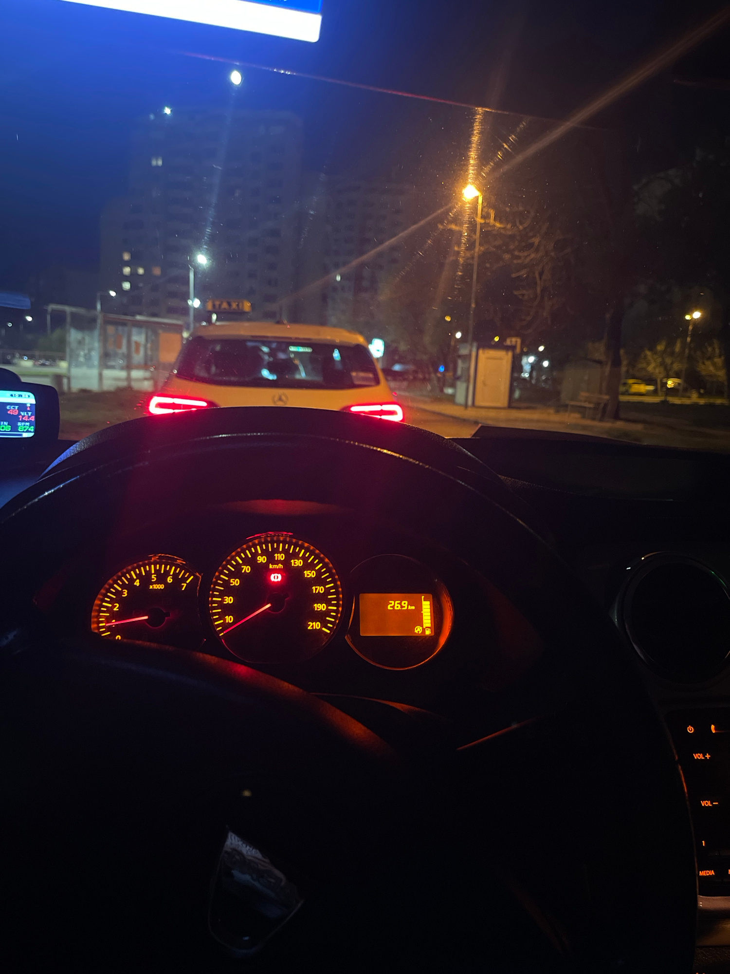 The image shows the dashboard and steering wheel of a car at night. The speedometer shows a speed near 0 km/h. The odometer displays "26.9km." The car is behind a taxi. The GPS device at the bottom of…read more