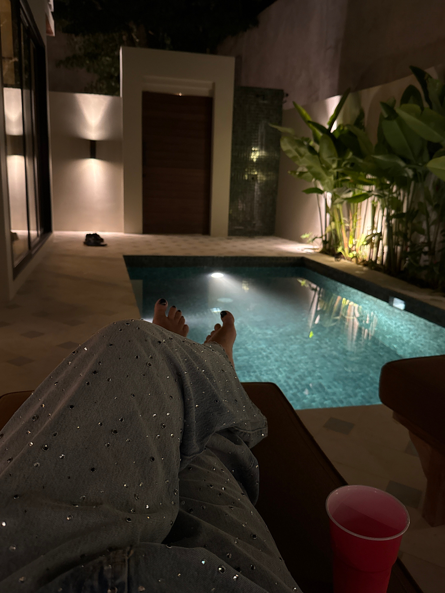 The image shows a scene at night, likely near a swimming pool in Kuta Selatan, Indonesia. A person is sitting with their legs extended towards the pool's edge. They are wearing dark blue denim pants w…read more