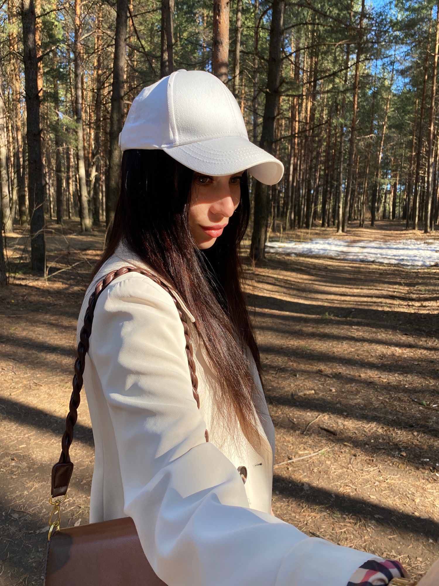The image shows a woman with long dark hair wearing a white baseball cap and a white jacket. She is standing in a forest with tall trees. Some snow is visible on the ground. The location is the city o…read more
