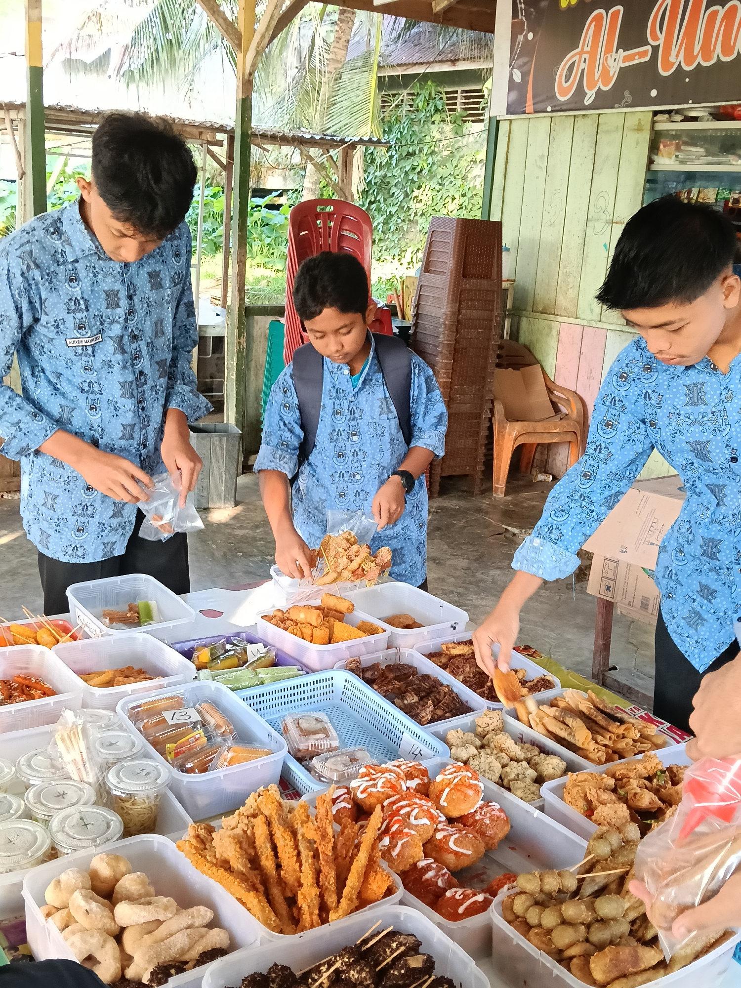 Three young men wearing matching blue patterned shirts are standing around a table laden with various foods. The food is displayed in clear plastic containers and includes items such as fried snacks,…read more