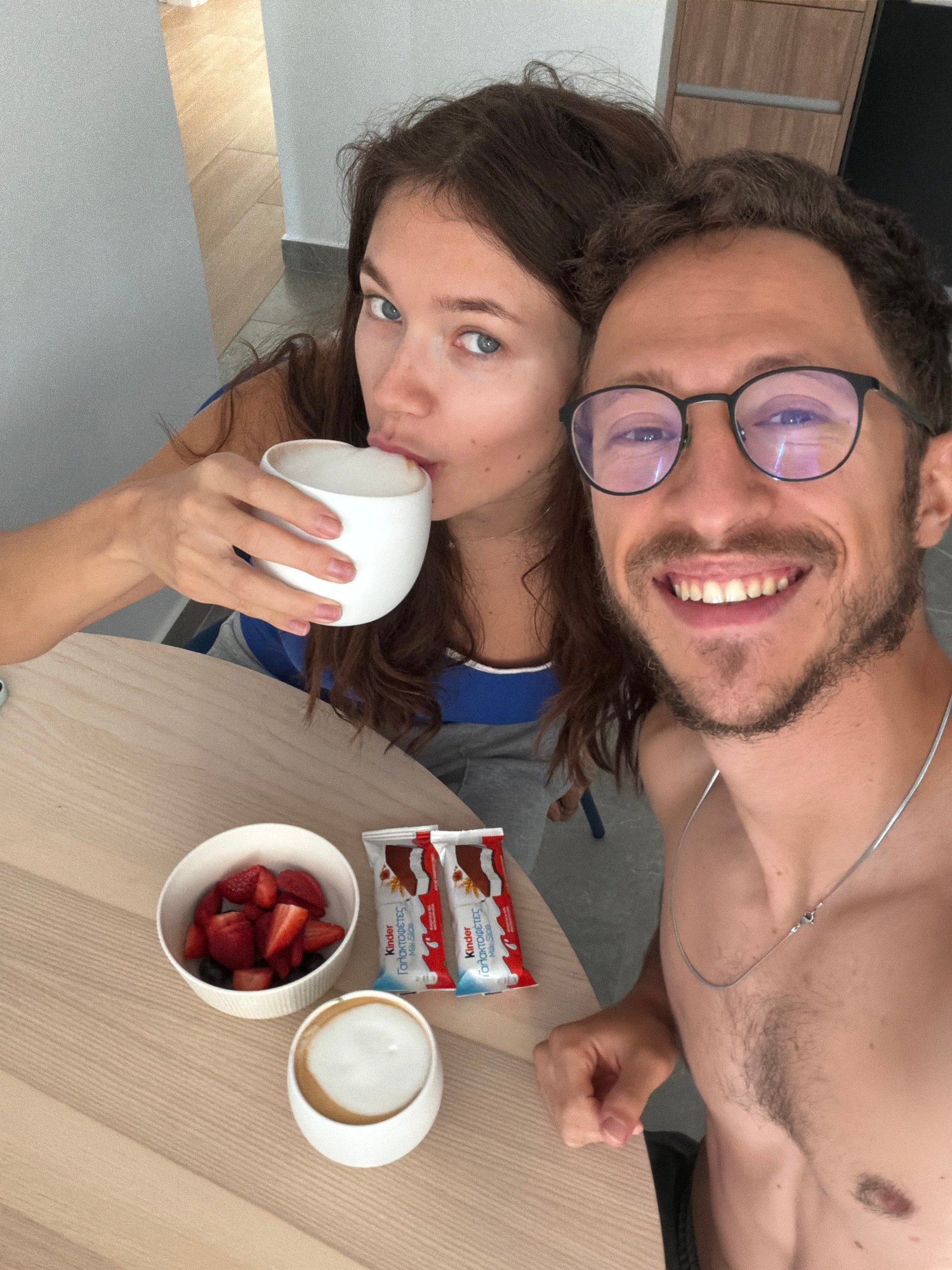 A selfie taken indoors in Livadia Larnakas, Cyprus shows a light-skinned man with dark hair, a beard, and glasses smiling at the camera. He is shirtless and wearing a silver chain. Nestled against him…read more