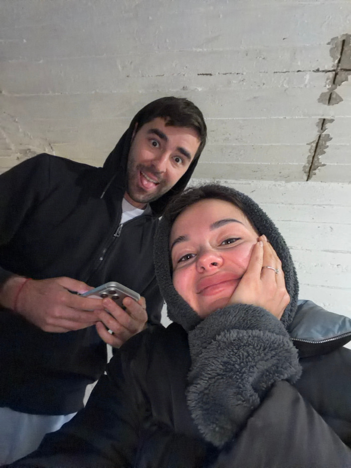 The image depicts a close-up, selfie-style photograph of two individuals, an adult female and an adult male. The female, positioned in the foreground on the right, has fair skin and dark hair, and is…read more