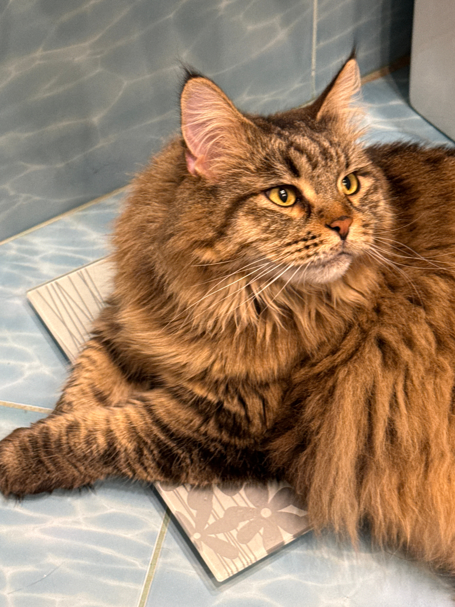 A fluffy, brown tabby cat with golden eyes lies on a tiled floor in what appears to be a bathroom. The cat is partially resting on a square tile with a floral design. The floor tiles are a light blue…read more