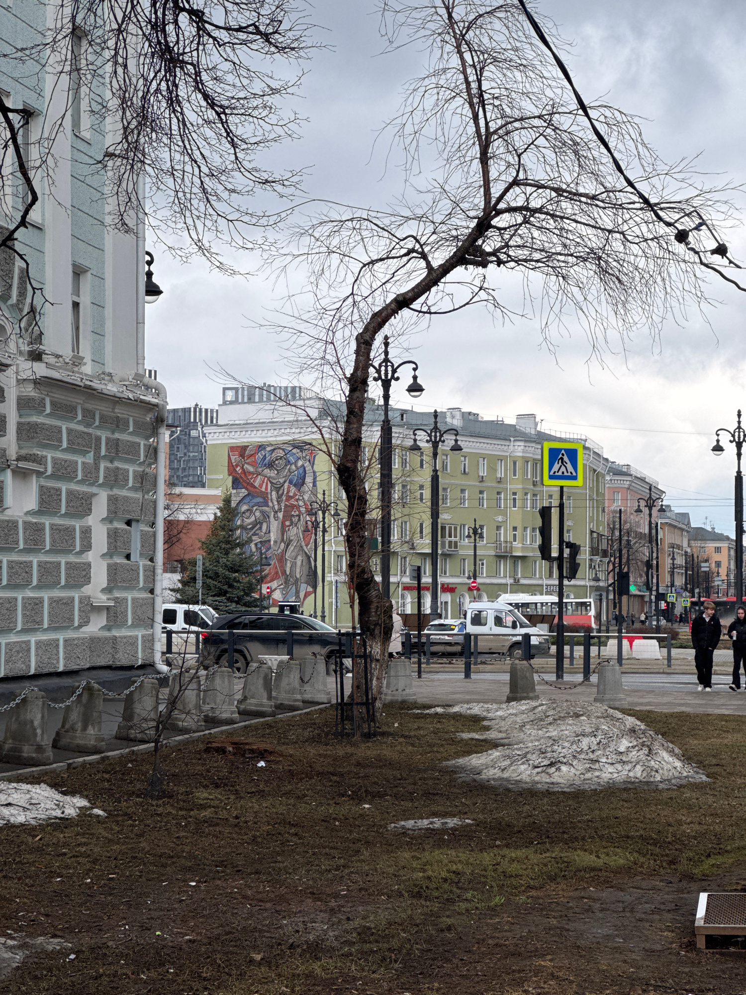 The image depicts a street scene in Perm, Russia, characterized by an overcast sky. The foreground includes a leafless tree obscuring parts of the scene, along with a building with a stone-textured fa…read more