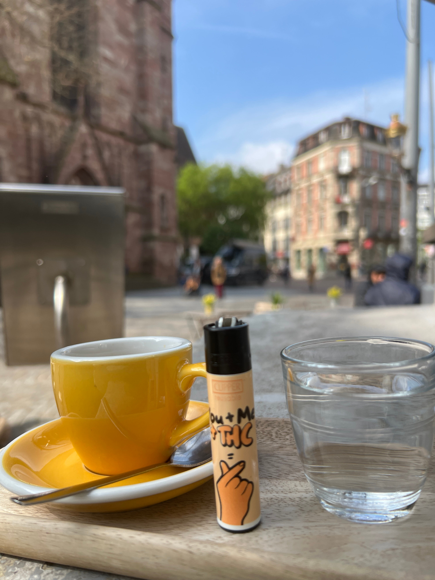 The photograph is taken at a table at an outdoor cafe in Strasbourg, France. A yellow teacup and saucer with a spoon are on the table. A clear glass of water and a lighter with a cartoon hand design a…read more