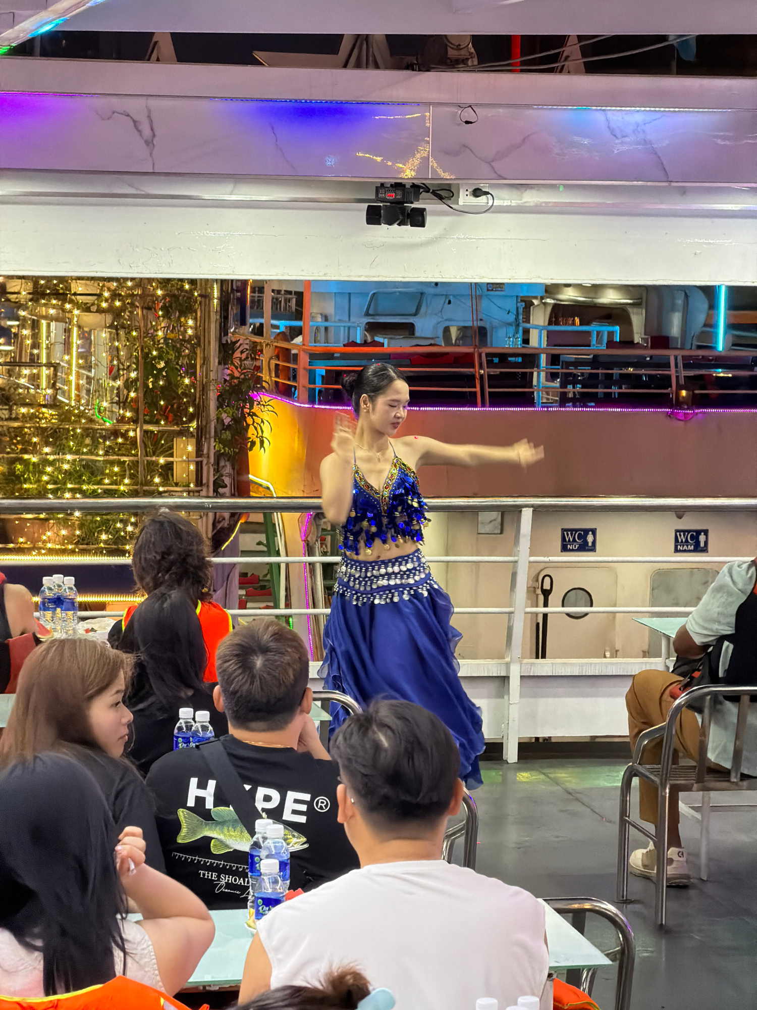 This image captures a vibrant evening scene aboard what appears to be a cruise ship or large tour boat in Đà Nẵng, Vietnam. The central focus is a woman performing a dance, dressed in a striking blue…read more