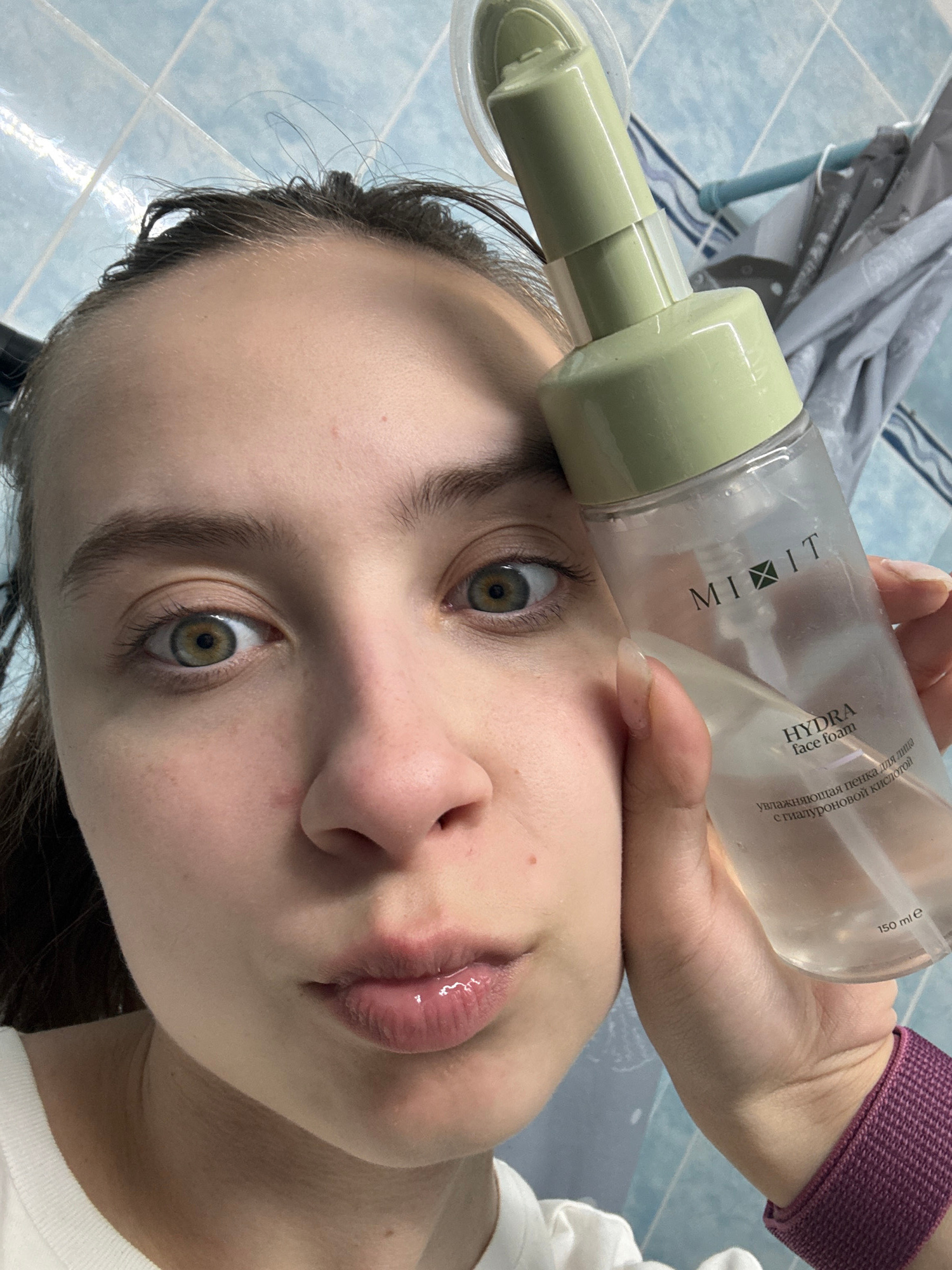 A close-up, slightly rotated photograph shows a young woman holding a bottle of "MIXIT Hydra Face Foam" against her forehead. She is gazing upwards towards the camera with wide, hazel eyes. The bottle…read more