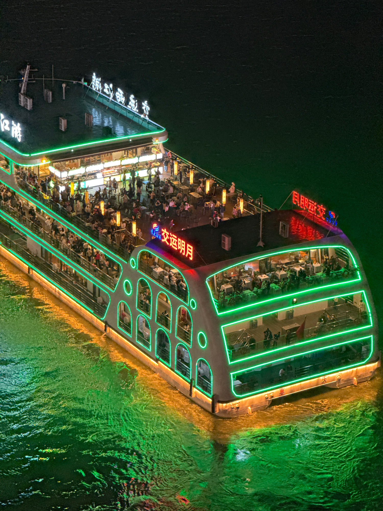 The image captures an illuminated, multi-level boat, seemingly a dinner cruise or leisure vessel, navigating a body of water at night. The boat is crowded with people, mostly seated at tables on multi…read more