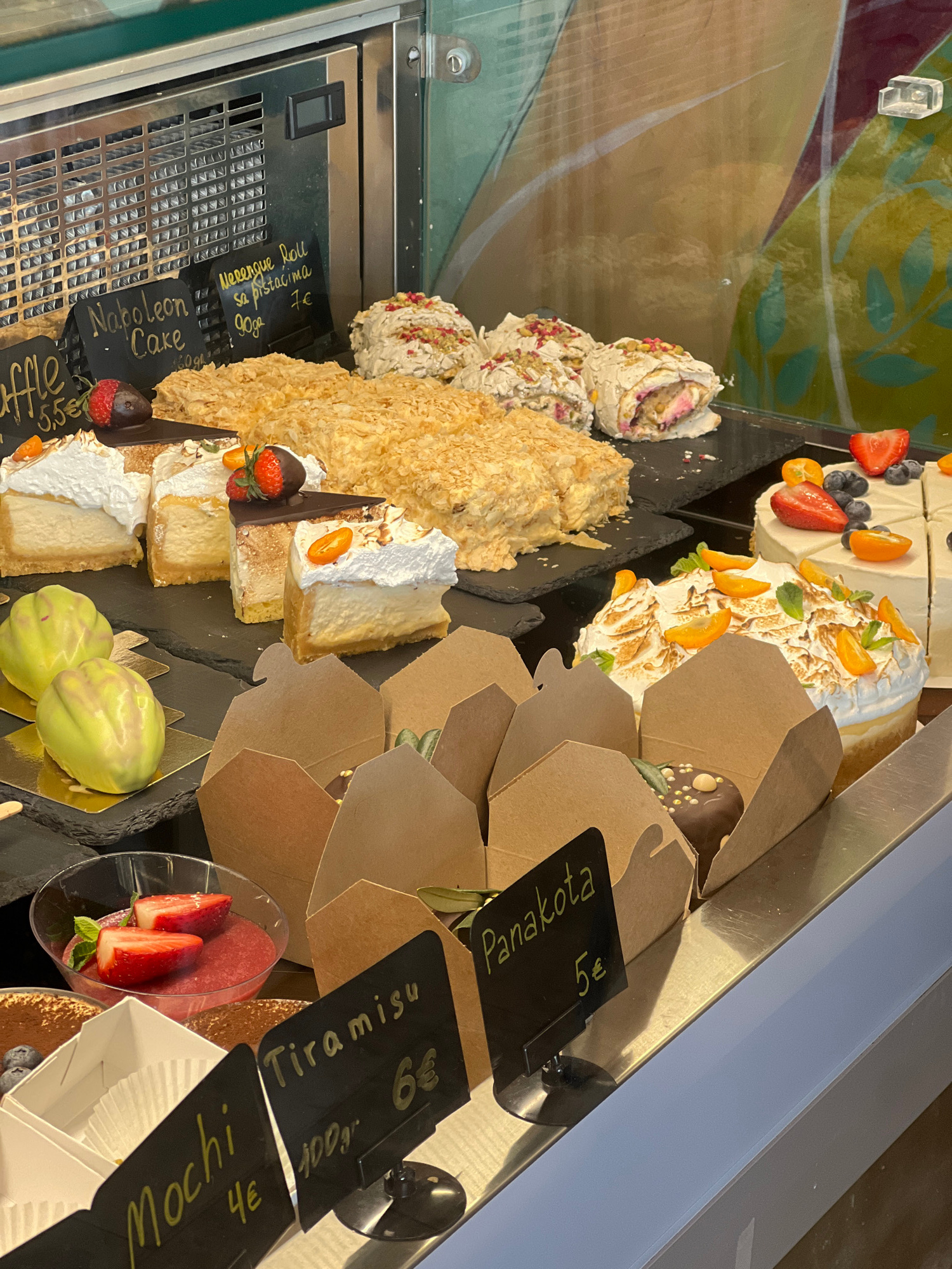 The image shows a display case in what appears to be a bakery or dessert shop, possibly located in Rafailovići, Montenegro, based on the text recognition of "sa pistacima." The case is filled with var…read more