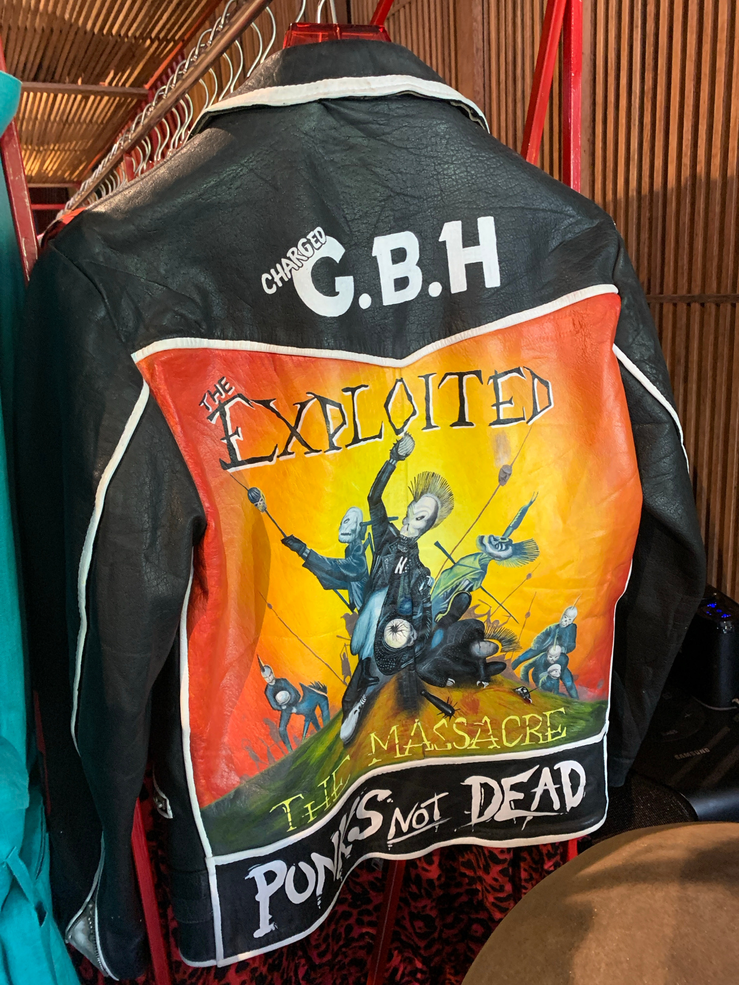 The image depicts a black leather jacket with a large, colorful graphic on the back. The graphic features imagery related to punk rock bands, including "The Exploited," "Charged G.B.H." and the text "…read more