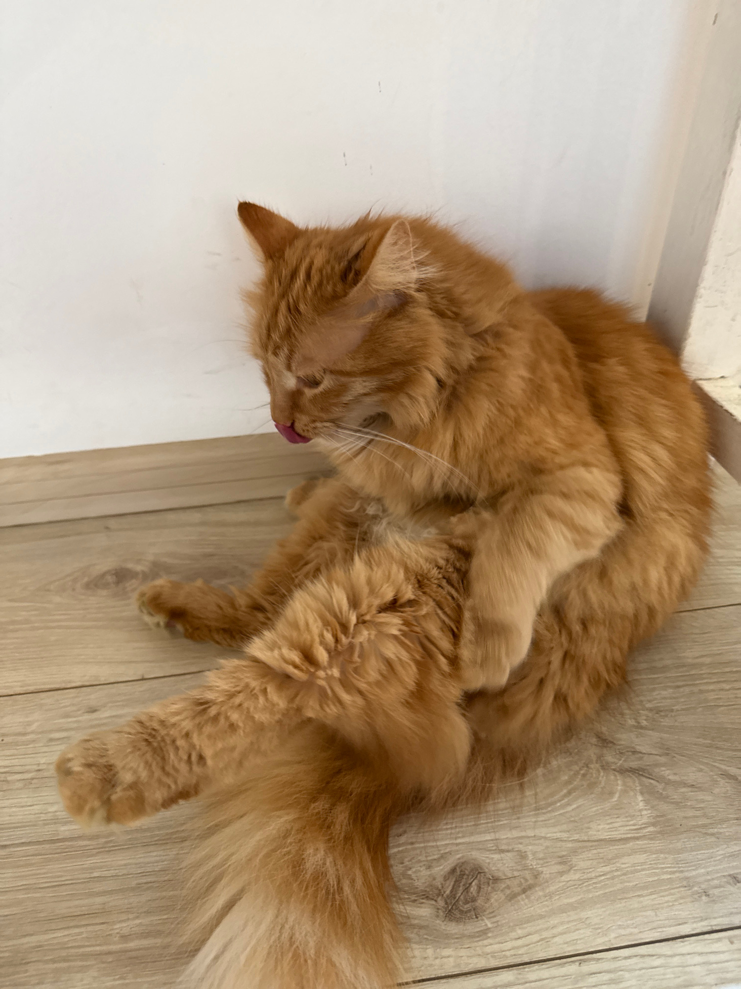 A long-haired, ginger cat is lying on a light wood-grain floor next to a white wall. The cat is curled up, grooming itself with its tongue sticking out. The scene appears to be indoors. This image was…read more