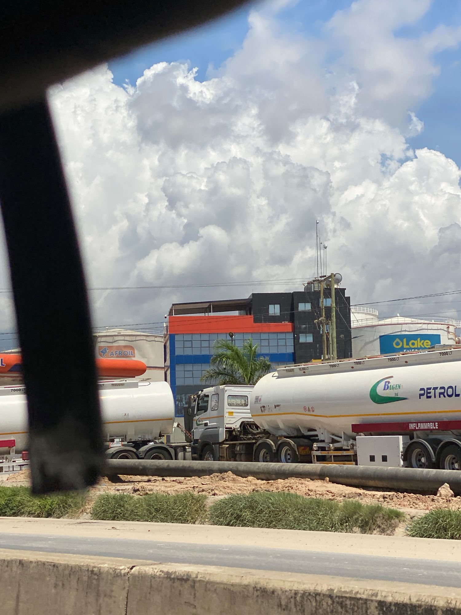 The image shows a street scene in Dar es-Salaam, Tanzania. In the foreground, there is a black metal structure partially obscuring the view. Along the roadside, a series of oil tanker trucks are parkeβ¦read more