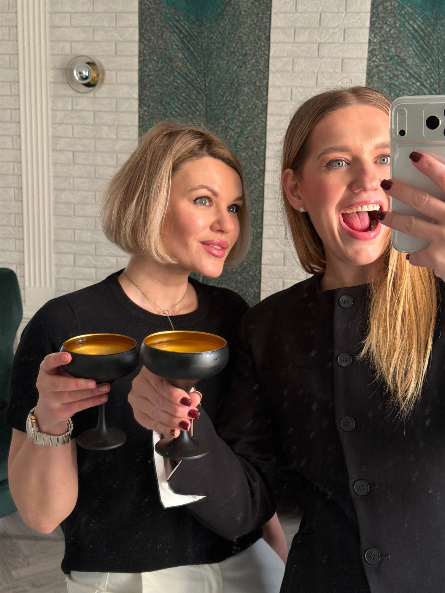 The image is a selfie taken in a bathroom, reflecting in a mirror. Two women are visible in the reflection. The woman at the top of the frame is holding the camera and making a playful face with her m…read more