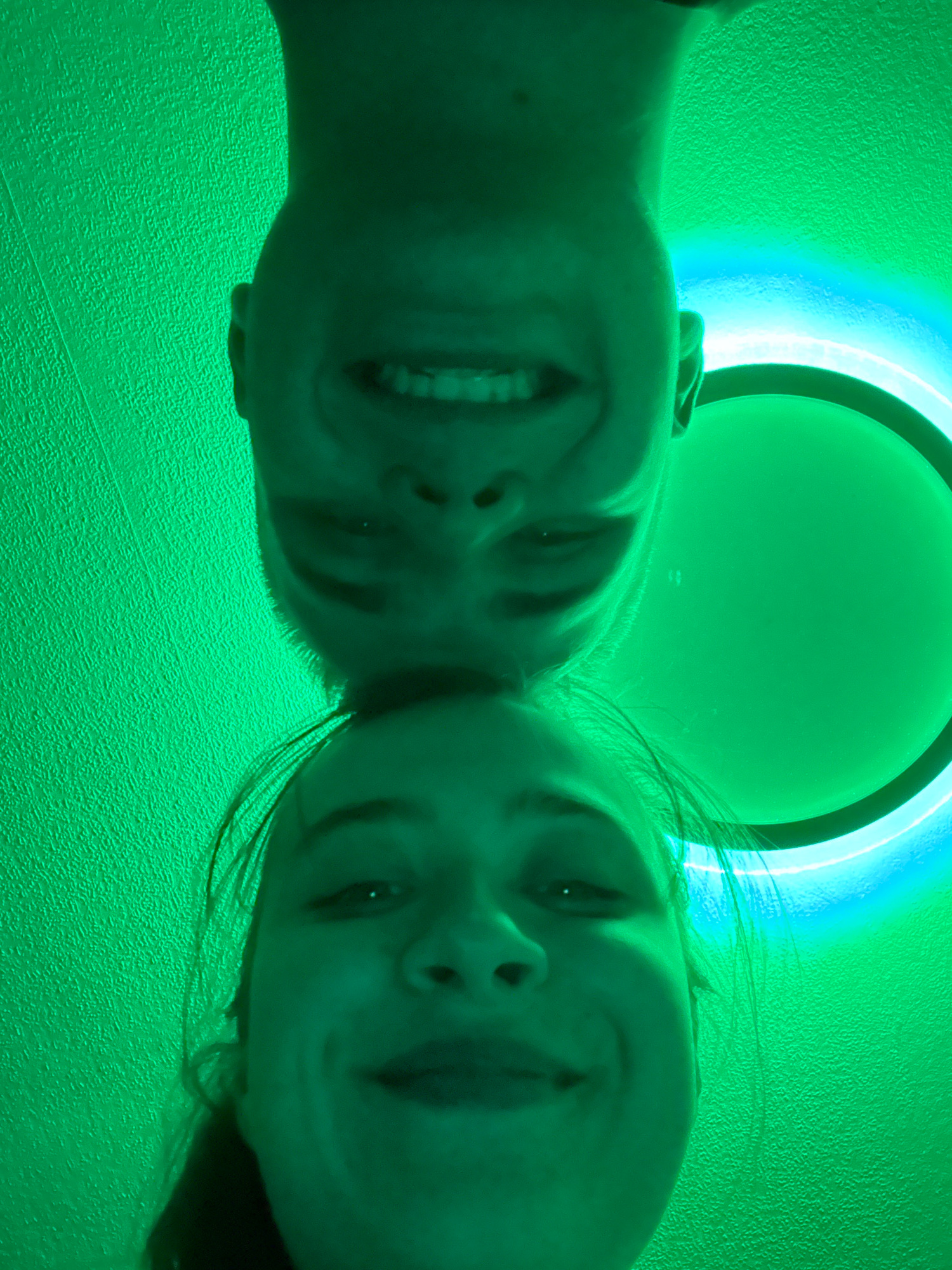The image presents a low-angle, close-up perspective of two individuals, likely adults, looking downwards into the camera. Their faces fill the lower half of the frame, with the tops of their heads po…read more